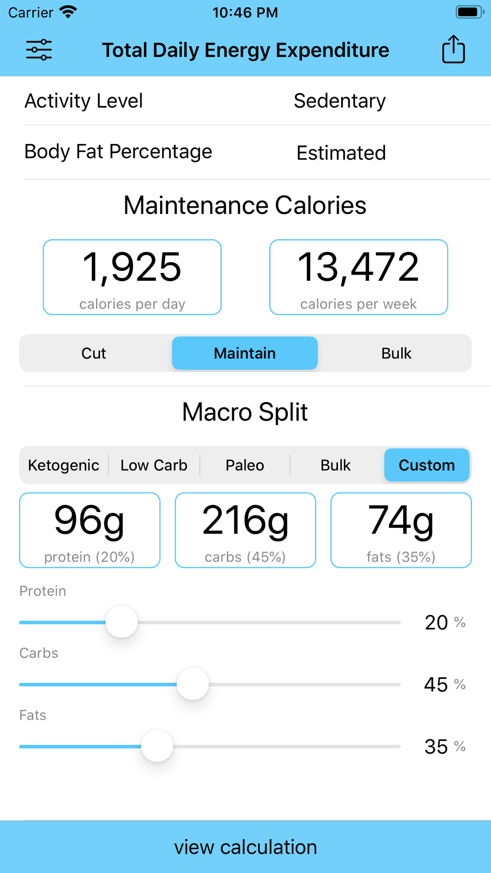 TDEE allows you to quickly estimate your ideal calories for a day based on a few simple data attributes. The result may then be adjusted for a cutting or bulking phase. Macros can instantly be calculated and customised to form the basic of a diet plan.