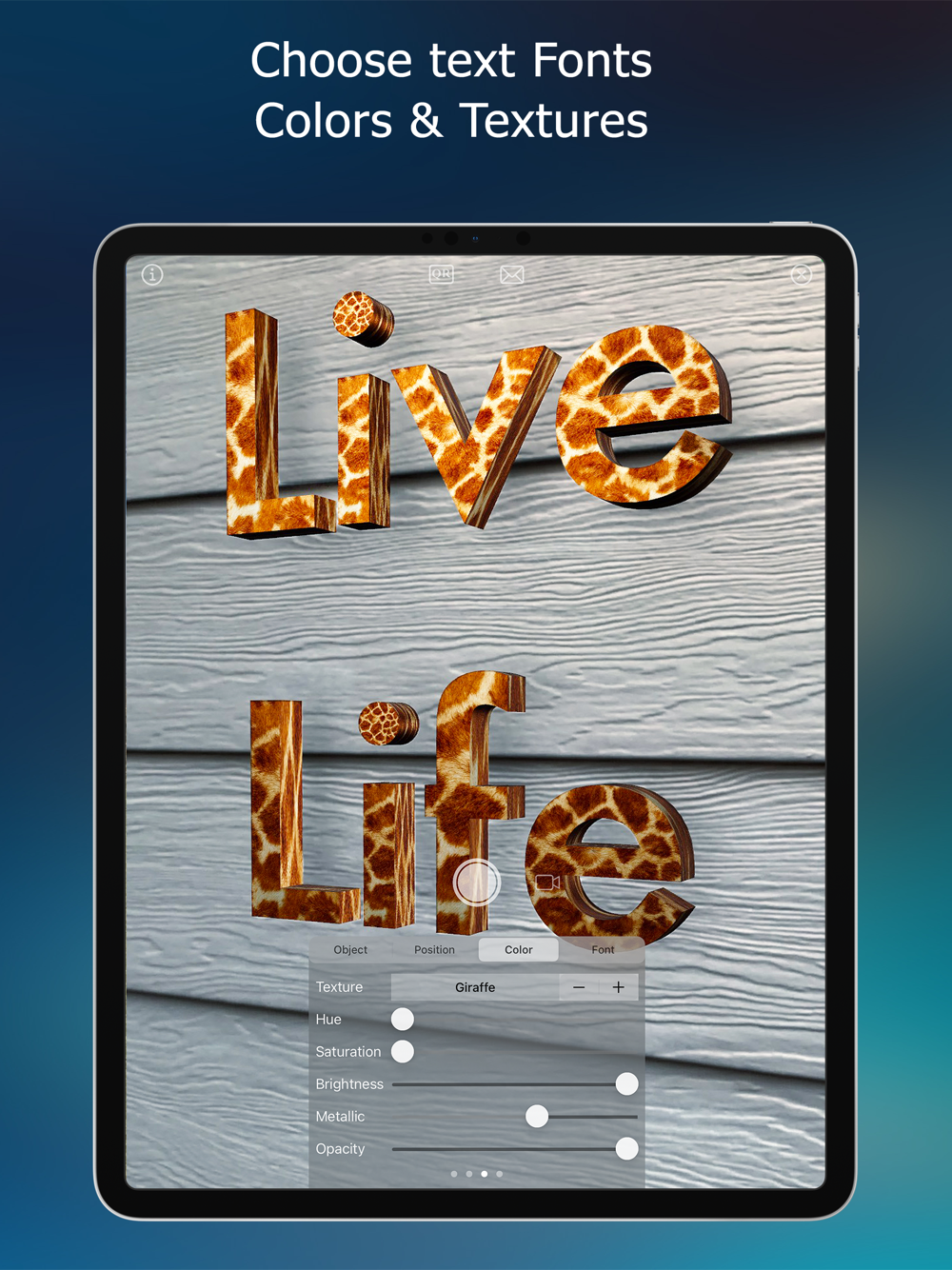 • Create words, phrases or entire paragraphs of 3D text in Augmented Reality, and add 3D AR Emojis.