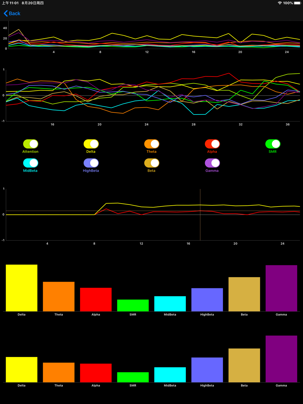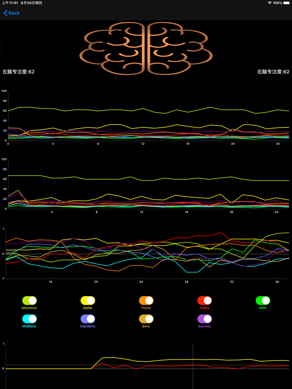 BrainLink Dual is a brain wave detection device that supports dual-channel detection. The data collected by this software includes: Raw data, EEG Bar, low-frequency to high-frequency distribution map, Delta, Theta, Alpha, SMR, MidBeta, HighBeta, Gamma,, Attention, etc.