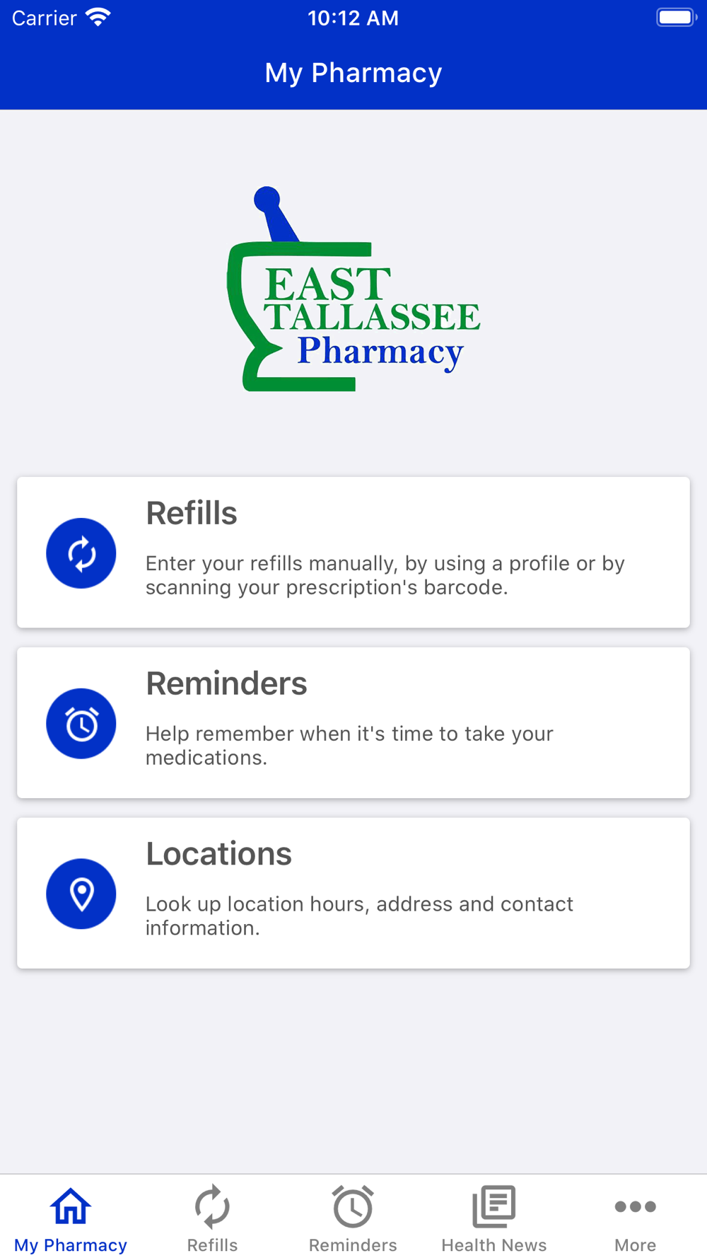 The East Tallassee Pharmacy app allows you and your family to securely communicate with your local pharmacy. Refill your prescriptions with one click, get refill reminders, get discounts at your local pharmacy, get savings on brand drugs and access Pharmacist written pages that help you understand your condition or medications.