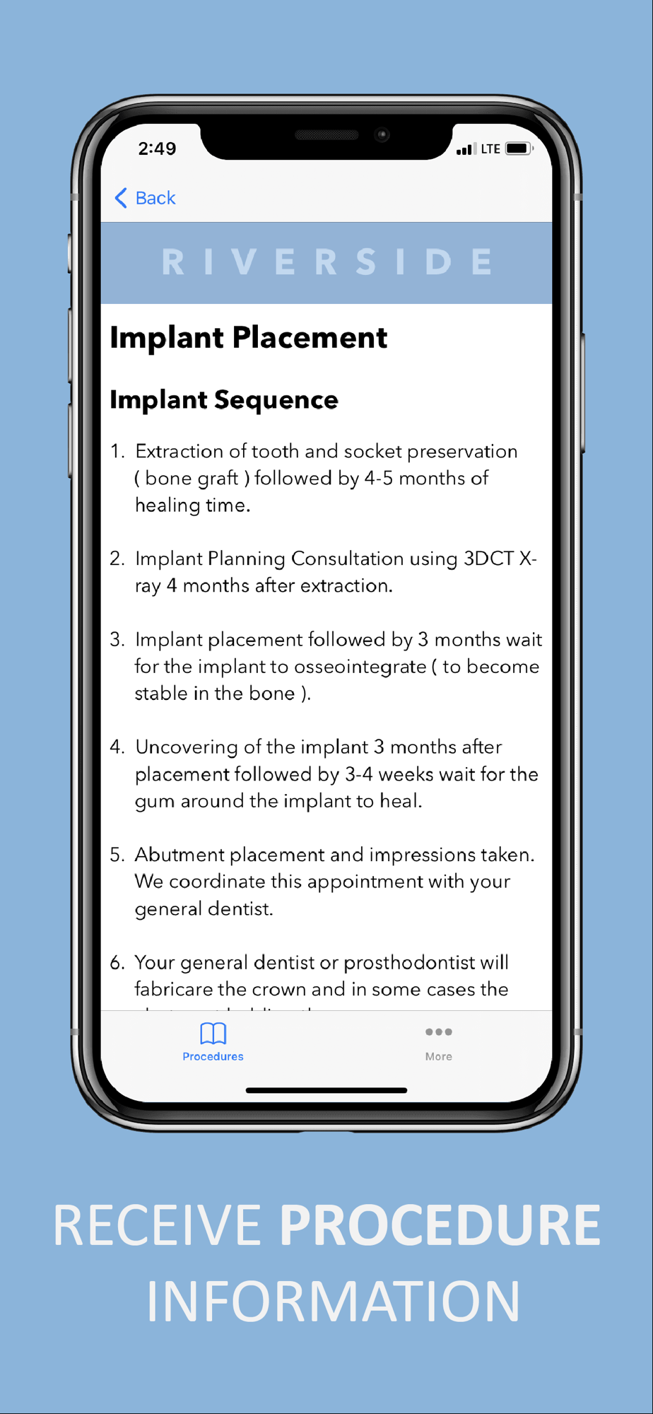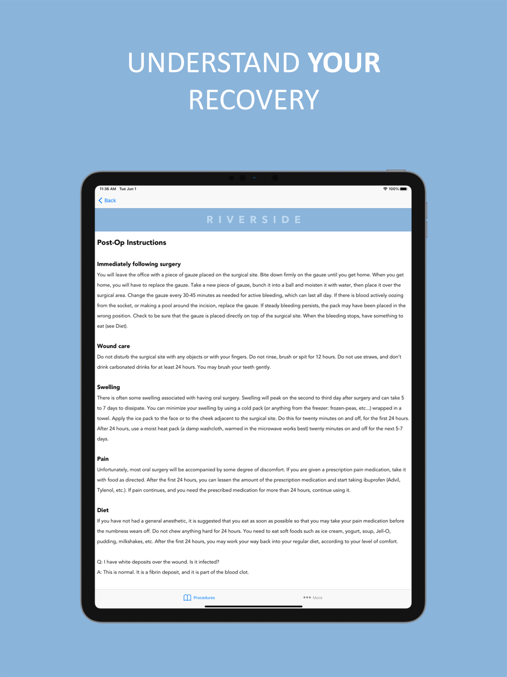 Be prepared for your surgery using the Riverside Oral Surgery app. You can find all the information you need to know about your surgery so that you can have a more timely recovery. You will also find important contact information in case you have any further questions.