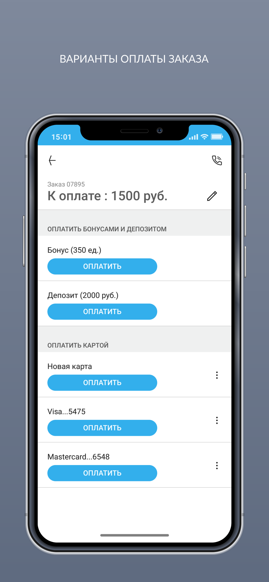 - оплатить заказы банковской картой, бонусами или депозитом;