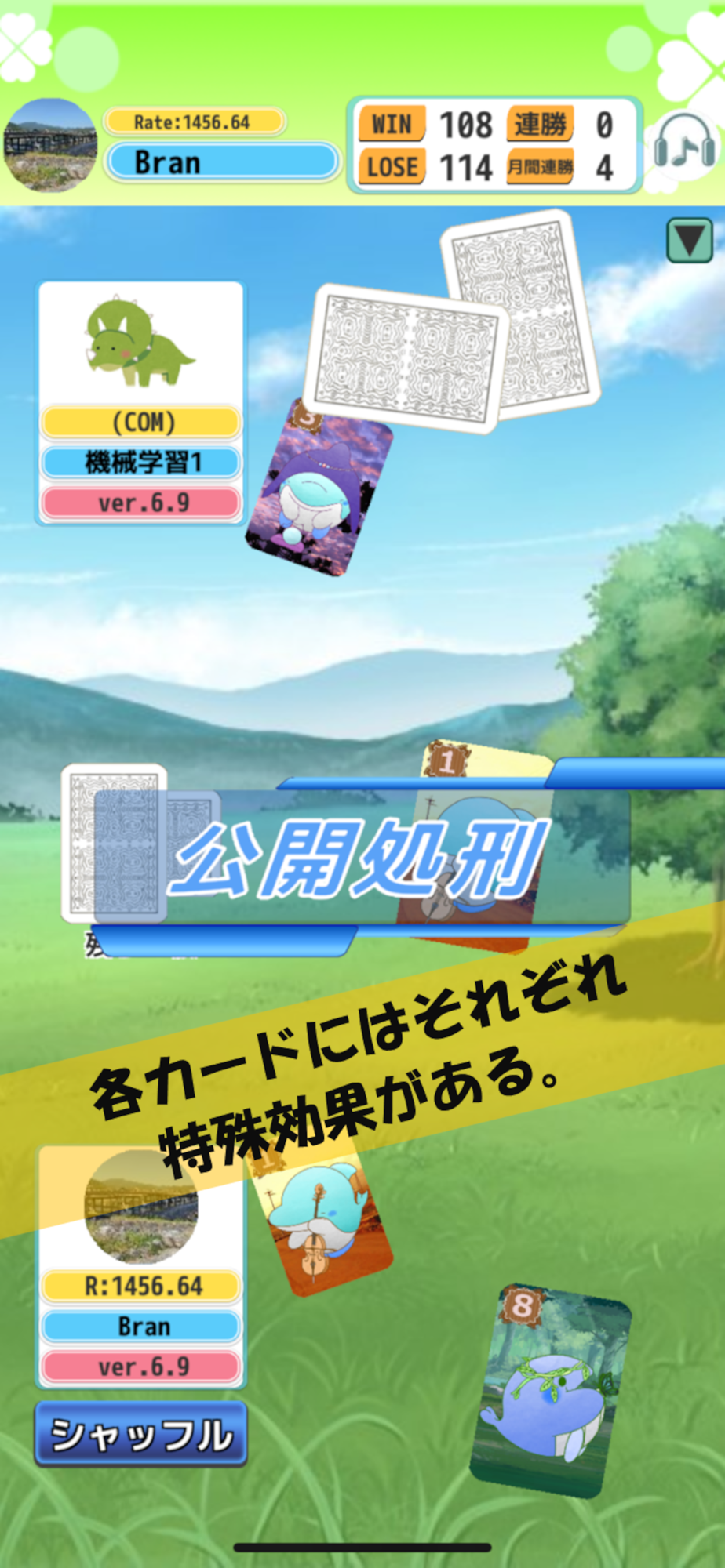 各プレイヤーは順番に山札からカードを1枚引き、手札の中から使用するカードを1枚選ぶ。