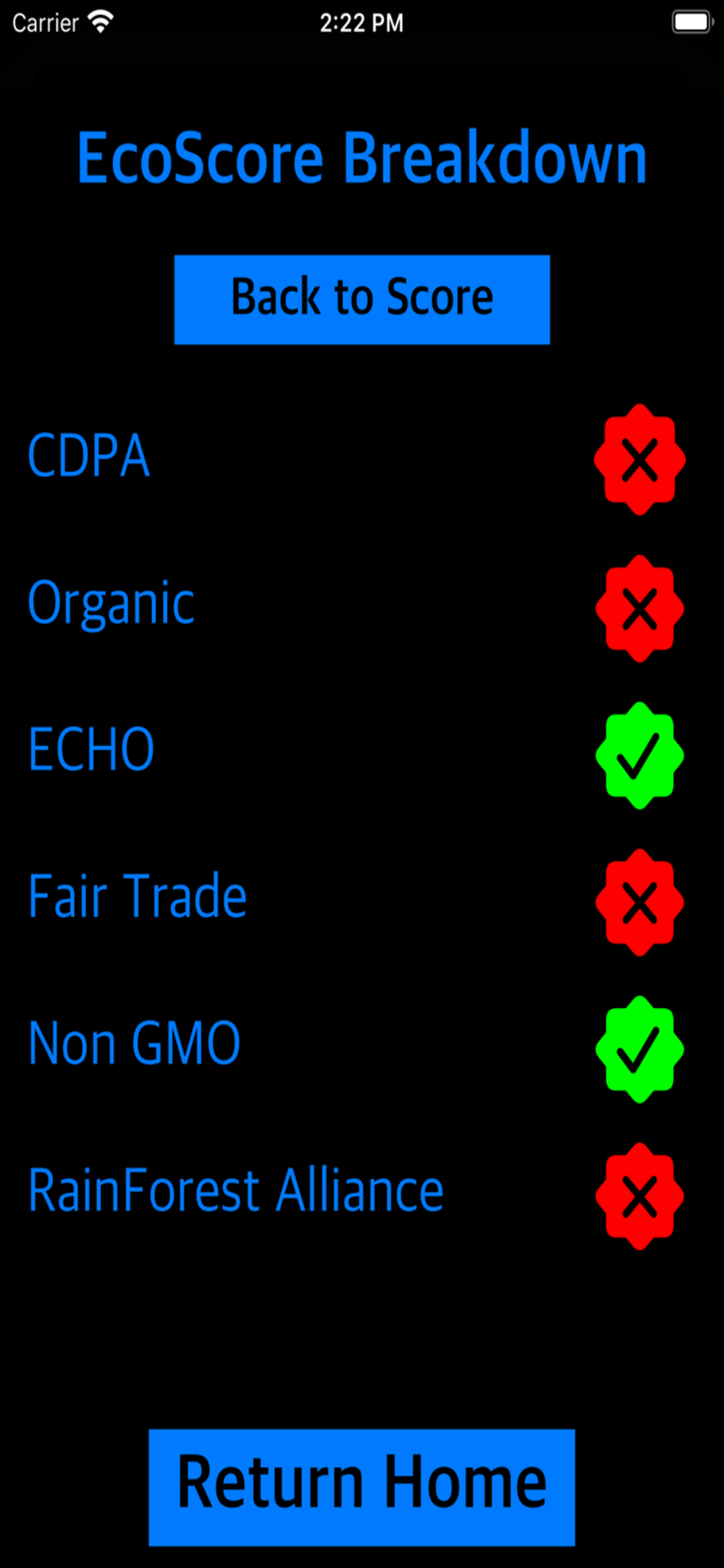Easily scan and identify which products across stores are environmentally friendly. Each item receives a score, followed by a breakdown of why the product received the score. Factors in various certifications and health standards across companies.