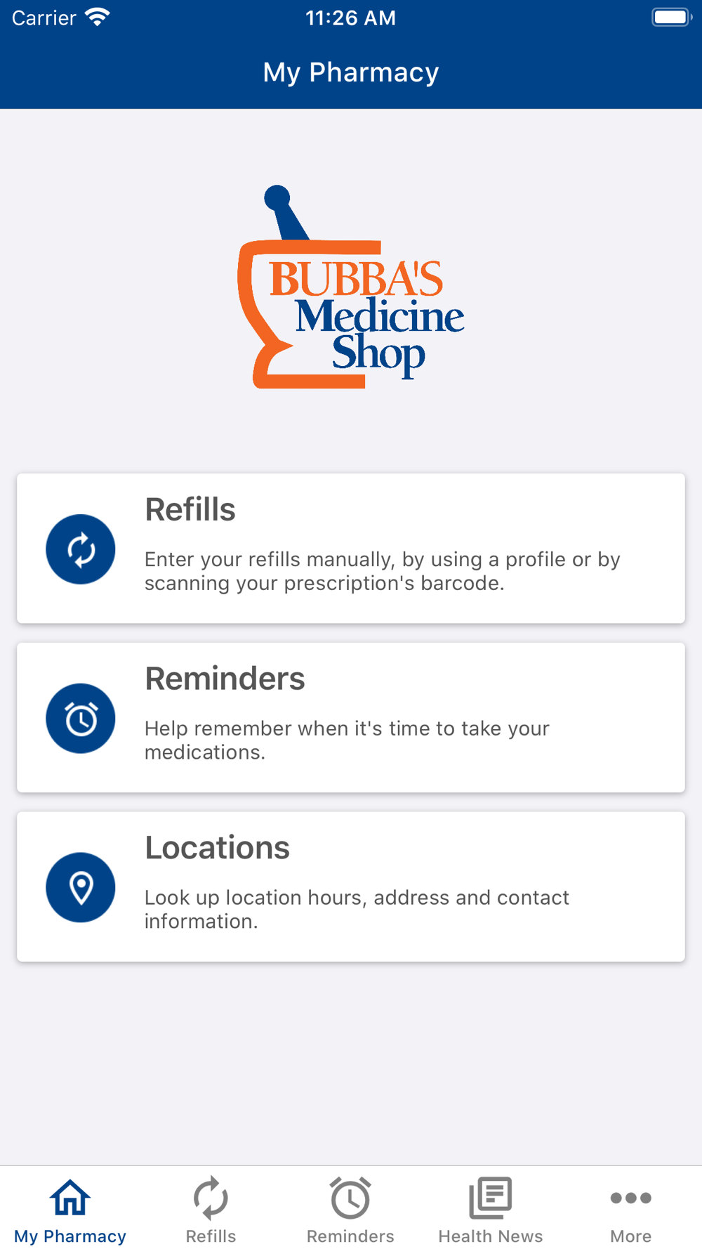 The Bubba's Medicine Shop app allows you and your family to securely communicate with your local pharmacy. Refill your prescriptions with one click, get refill reminders, get discounts at your local pharmacy, get savings on brand drugs and access Pharmacist written pages that help you understand your condition or medications.
