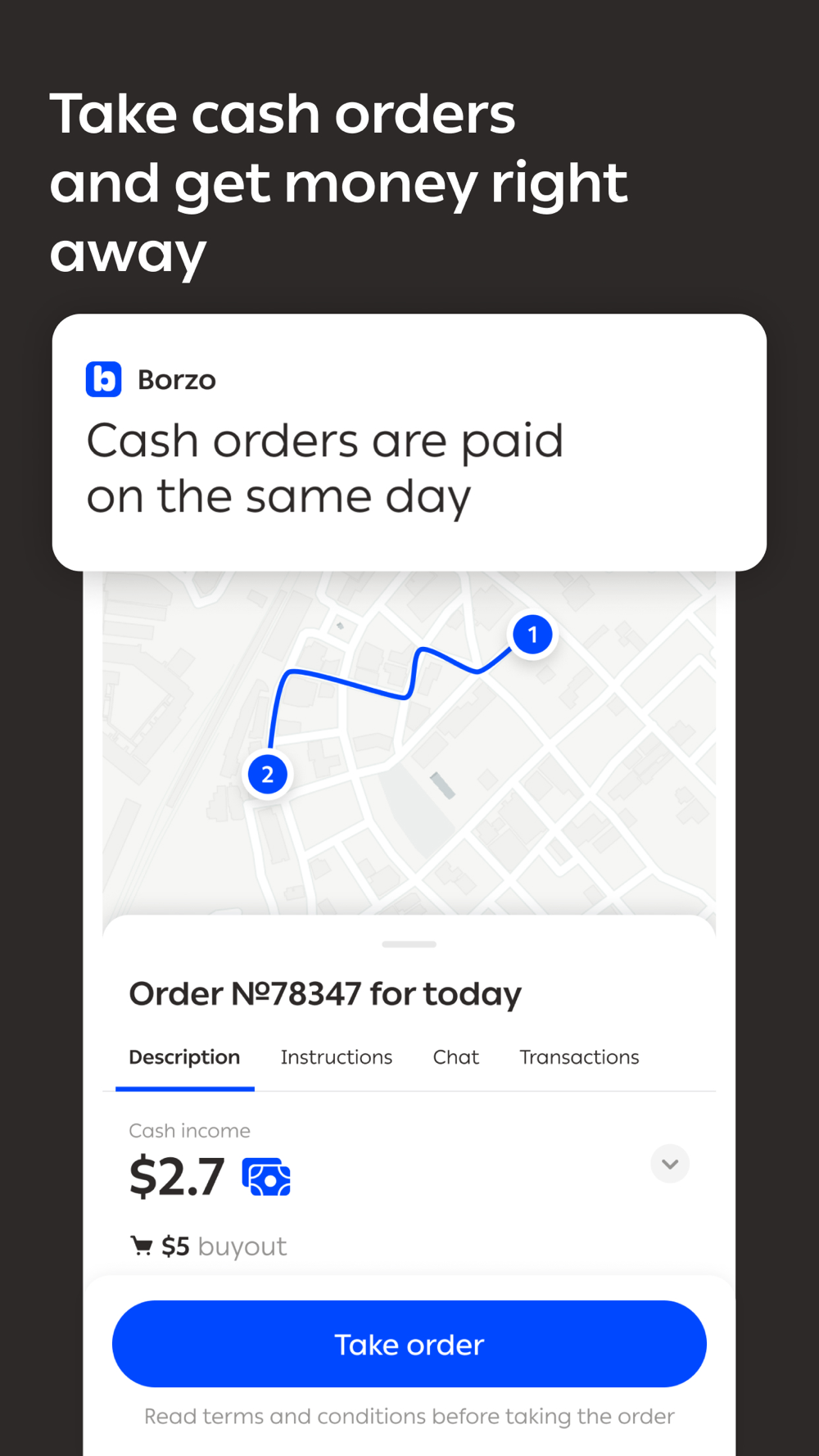 Get money immediately with no delays — payouts almost every day. Download the Borzo delivery app for couriers and track your earnings and tips.