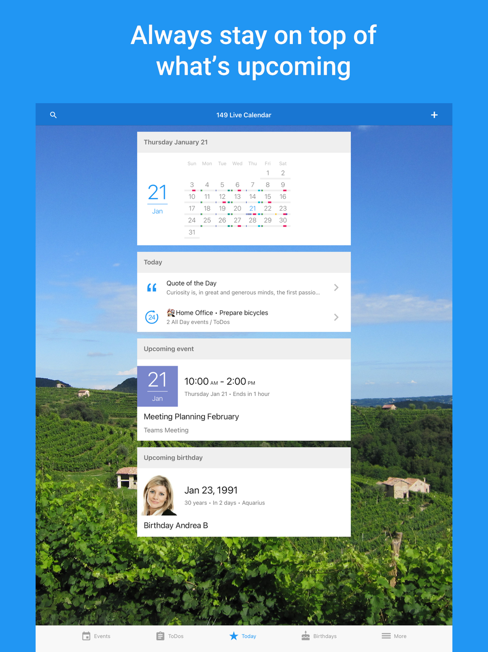 • Add pictures to events, and use our categories and 40+ available colors for the best overview of all your events, birthdays and ToDos.