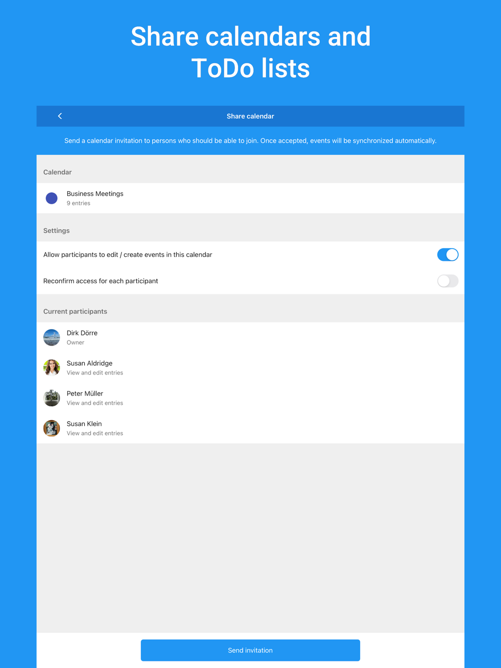• Use calendars and ToDo lists together with family, friends or team – easy, fast, and reliably, including change history, update notifications, access management and more!