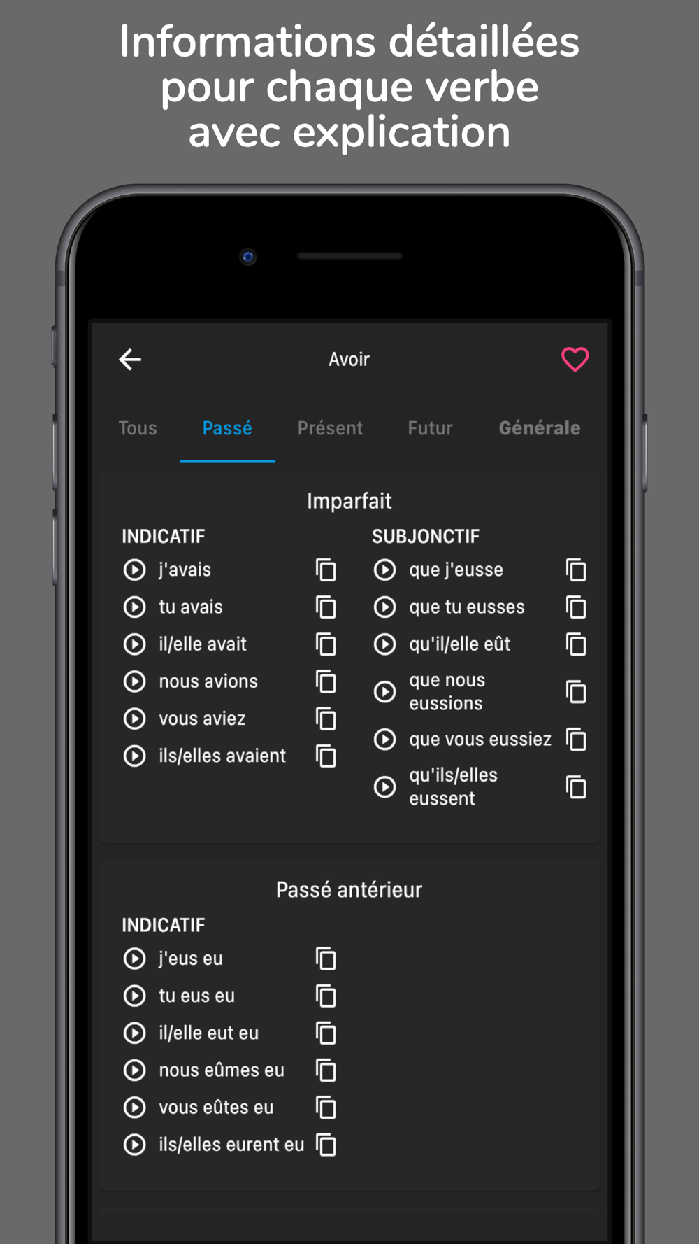 - Toutes les formes pour chaque verbe, y compris la prononciation vocale