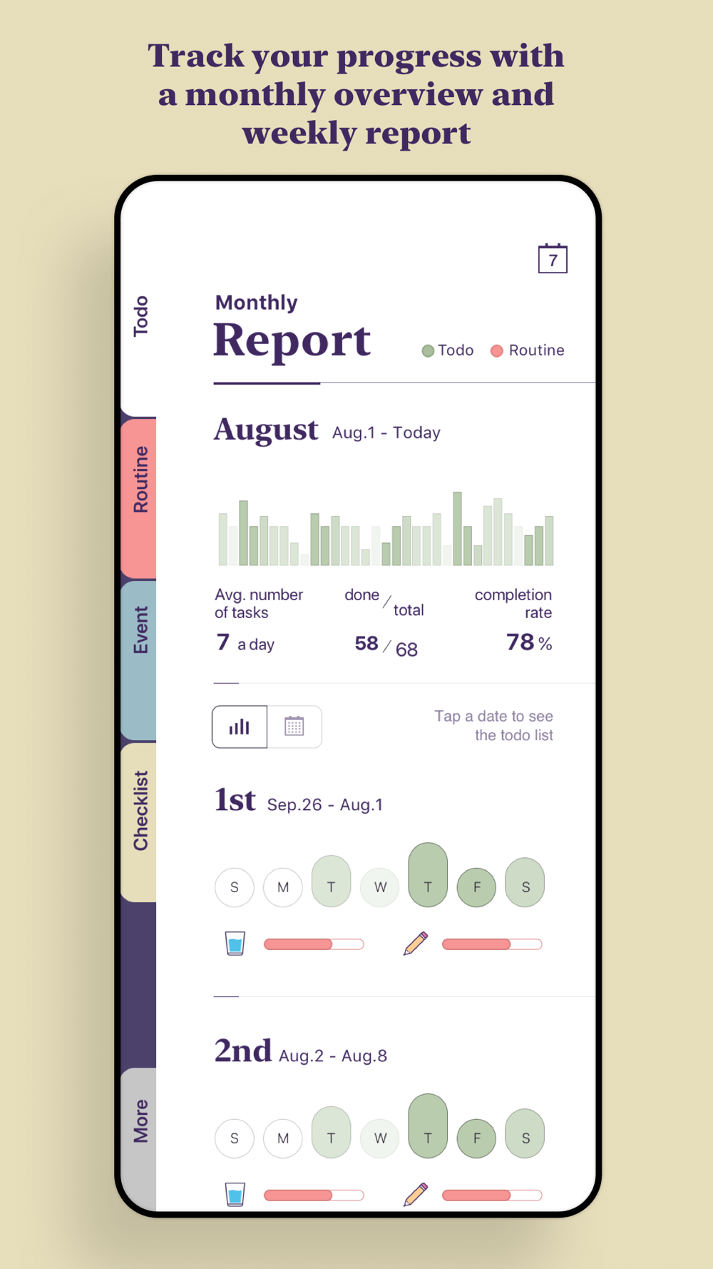 Keep track of your progress with a monthly overview that shows completed tasks, upcoming events, and more.