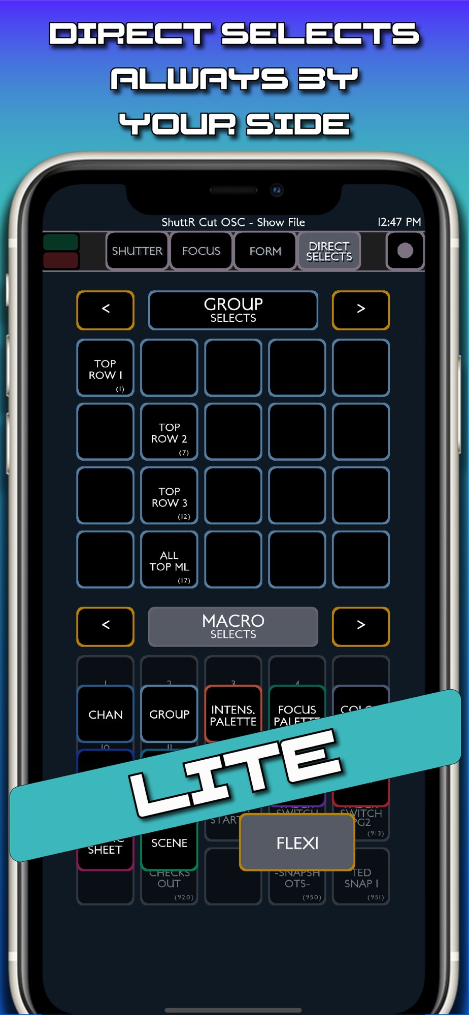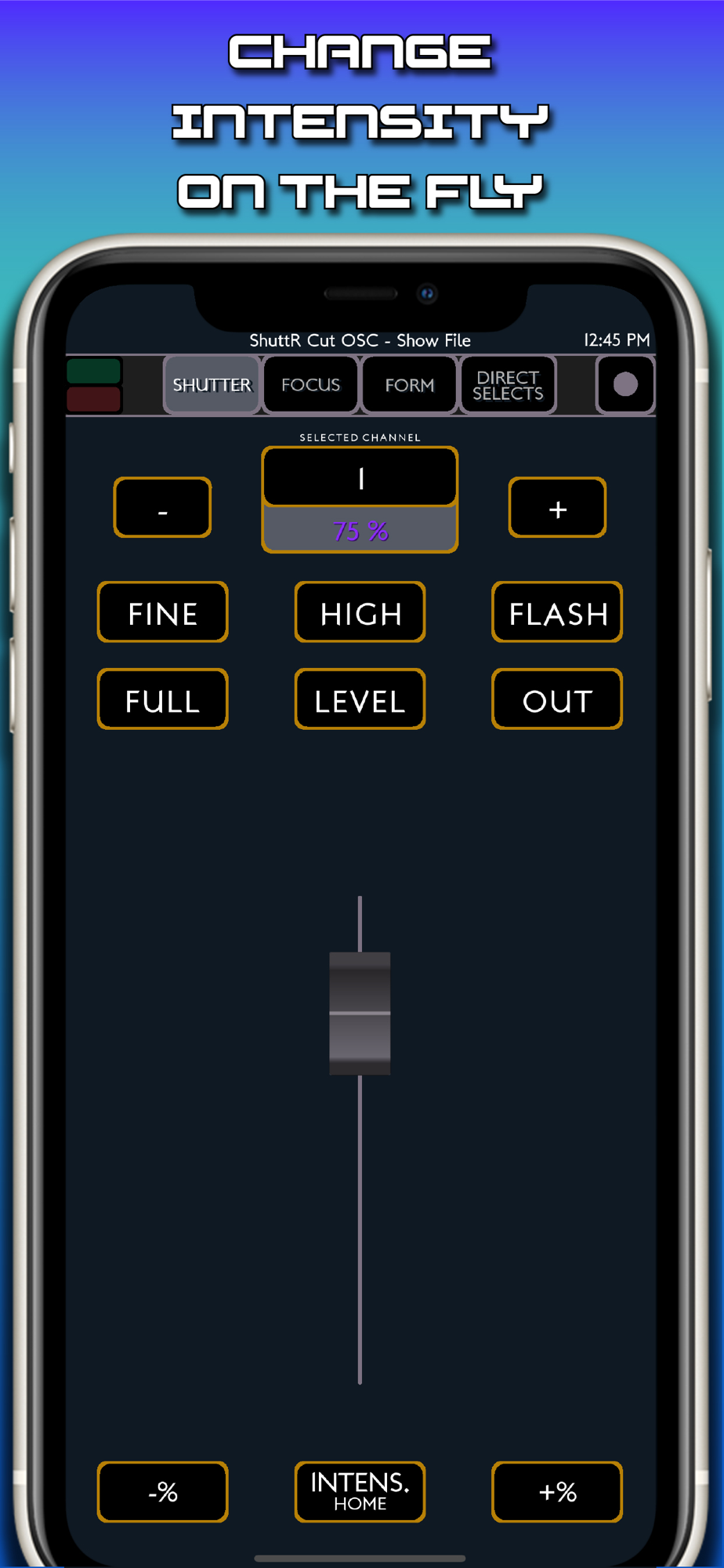 By sending and receiving open sound control packets (OSC) through TCP, the app allows feedback to see what exactly your moving lights are doing. Freeing your screen real estate for other information. The app made by lighting programmers for lighting programmers. Taking the idea of radio focus remotes (RFR) and specializing it to moving lights. Controlling intensity, shutters, focus, form, and direct selects all from one app. Meant to sit alongside while you program.
