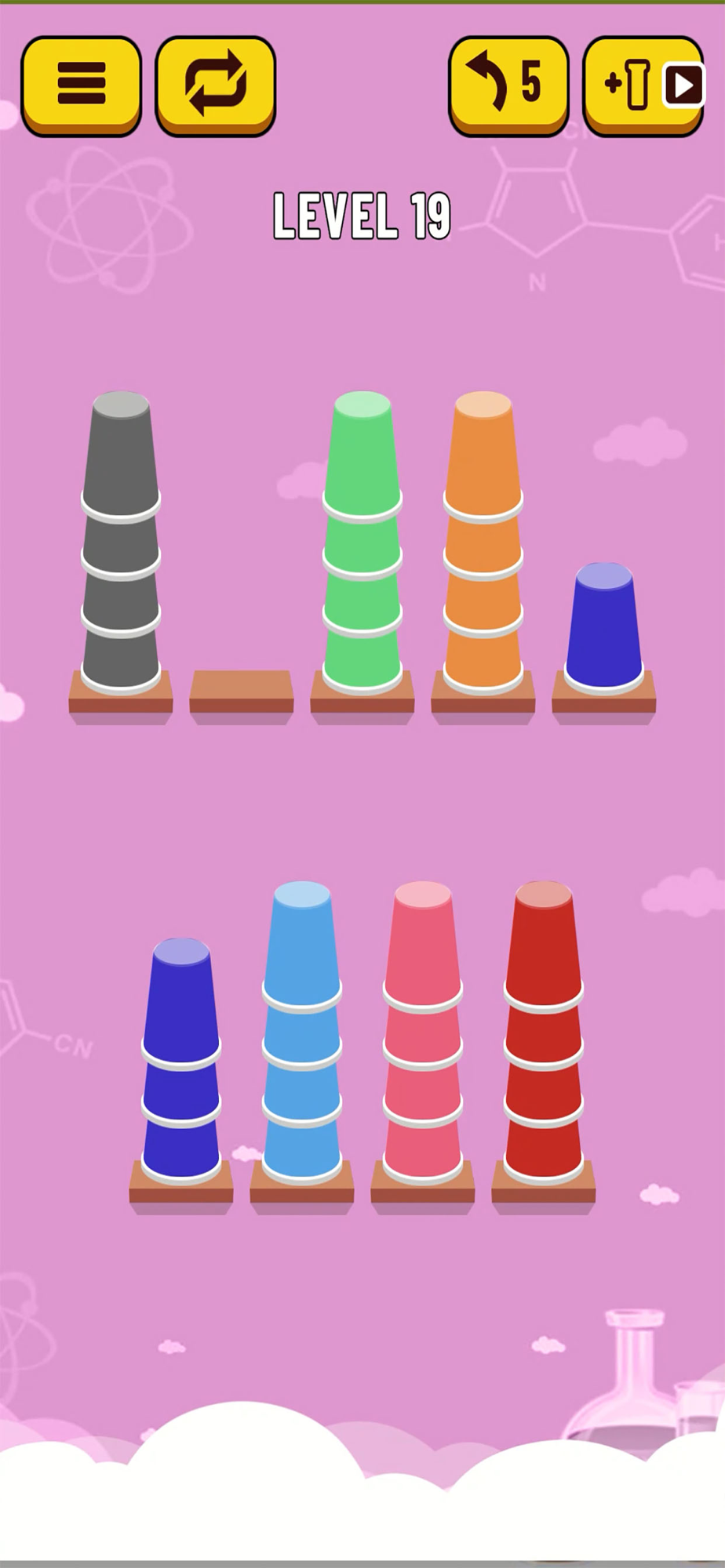 Cup Sort Puzzle is a fun and addictive puzzle game! Try to sort the colored cups in the stacks until all cups with the same color stay in the same stack. A challenging yet relaxing game to exercise your brain!