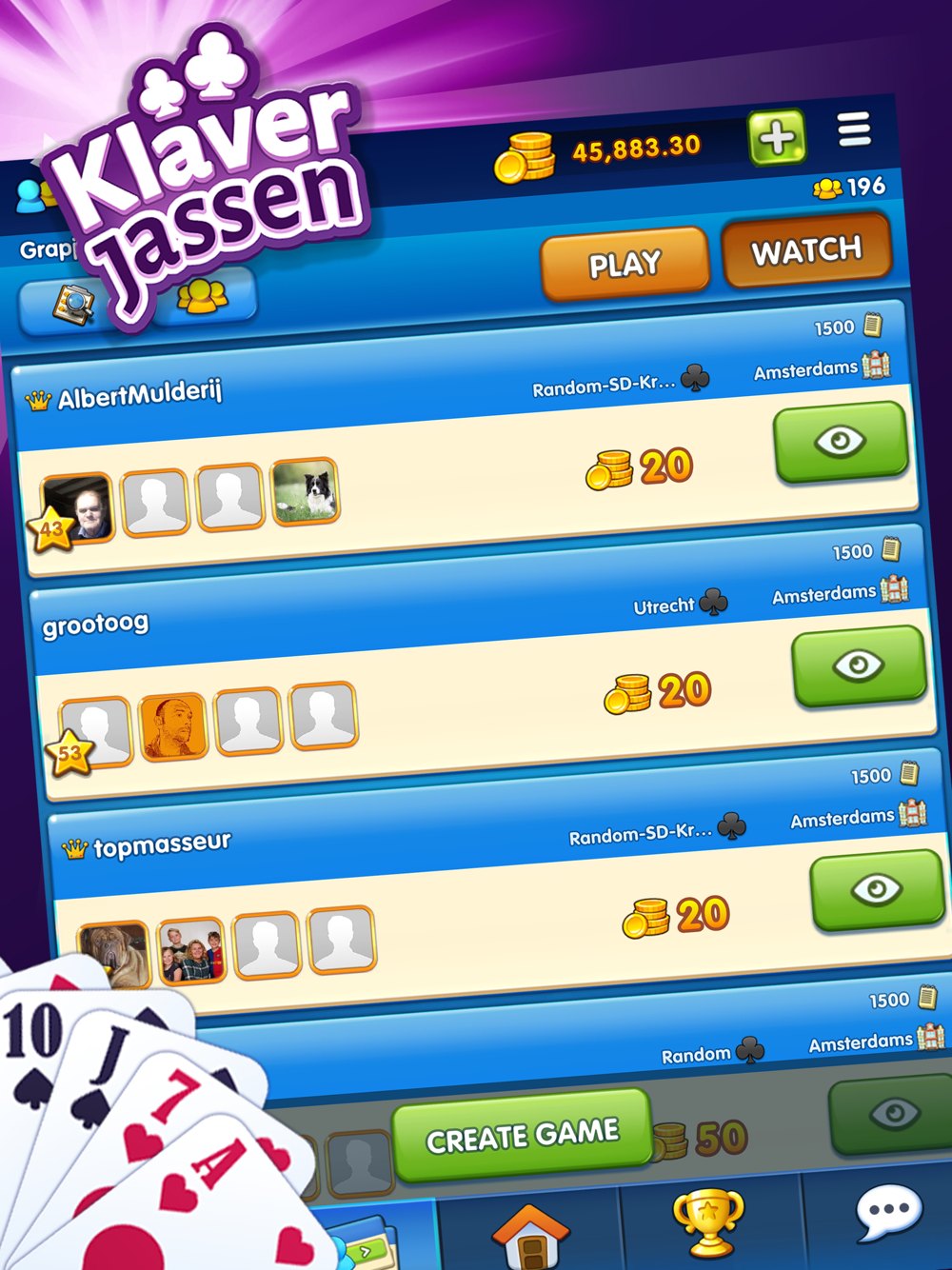 Download GamePoint Klaverjassen and enjoy a classic Dutch card game! GamePoint Klaverjassen is a free-to-play card game bringing all the best features from this Dutch classic game right to your mobile phone. Play against your friends, family or Klaverjassen players from all over the world anytime you want! Go head to head against your opponents and try to win a round and gain coins, experience, and achievements. Join the biggest Klaverjassen community and never get bored, you will always find people to play this classic card game with! GamePoint Klaverjassen is a game of skill and strategy, outsmart your opponent and become a champion of the best free card game! GamePoint Klaverjassen will give you the true authentic Dutch card game experience .GamePoint Klaverjassen is a 2v2 card game where the goal is to play the highest valued card each trick. Once every player has played a card, a new trick will begin. A single round consists of 8 tricks meaning every player always receives 8 cards at the start of the round.