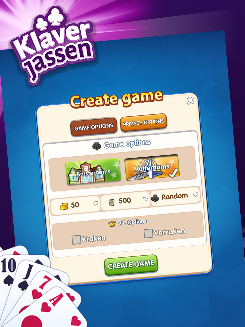 Choose from 2 exciting game modes! You can play with the Rotterdam or Amsterdam rules. In Rotterdam rules when a player cannot follow suit in a trick, they are obligated to play a trump card if possible. If they have a trump card that has a higher value than all the other cards currently played on the table, they must play the card.