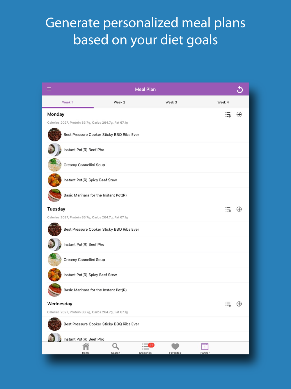Instant Cooker Recipes is a simple way to browse hundreds of recipes, create grocery lists, and personalize meal plans. Find recipes for your Instant Pot® or pressure cooker to quickly prepare your favorite foods. The app includes full nutrition facts, macro breakdowns of each recipe, and cooking directions.