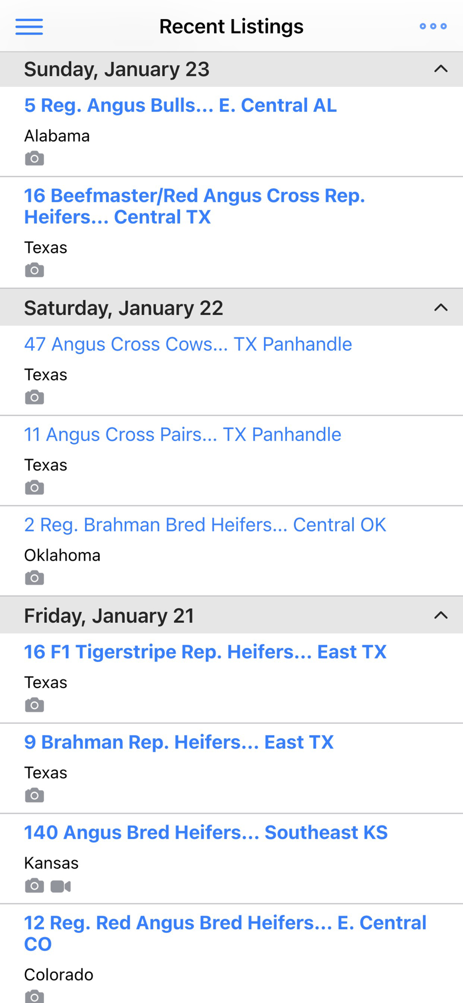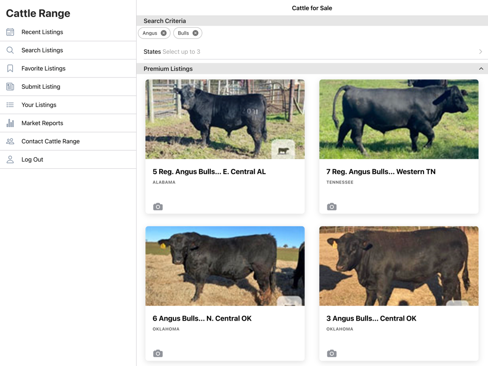 The Cattle Range mobile application offers quick and convenient access into the CattleRange.com listing directory. Search our entire listings database or submit your own listing and media from your mobile device. Listings can be filtered by Cattle Class, Breed, State, or combinations thereof.