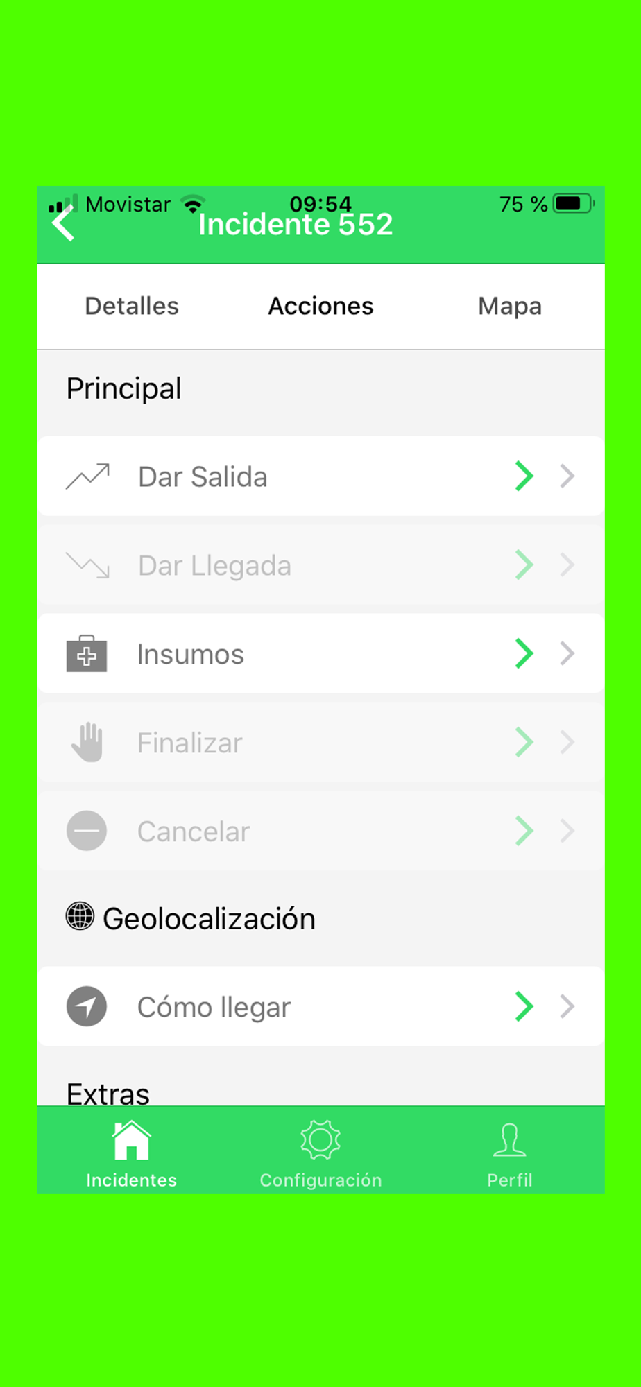 - Registrar los sucesos en tiempo real desde el movil (salida, llegada, derivación, internación, final)