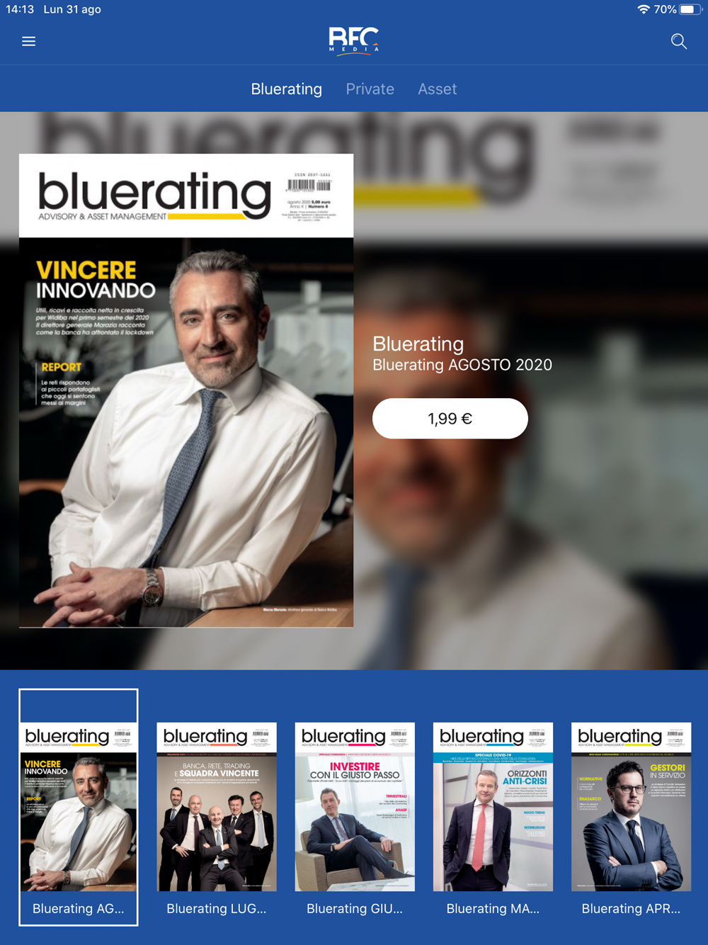 Blue Financial Communication è una media & digital company, specializzata nell’ informazione sul personal business e sui prodotti finanziari. La società, nata nel 1995 e quotata sul mercato AIM Italia di Borsa Italiana dal 11 dicembre 2015, edita BLUERATING, PRIVATE, FORBES ITALIA e ASSET CLASS. BLUERATING: brand forte e affermato nel mercato del risparmio gestito abbraccia sia le reti di consulenti finanziari che le case di asset management. PRIVATE: prima ed unica finestra in Italia dedicata interamente al mondo del private banking e alla vita del private banker. ASSET CLASS: il mensile è dedicato al mondo dell’asset management italiano e internazionale visto dai suoi protagonisti e alla luce delle nuove sfide regolatorie e di mercato.