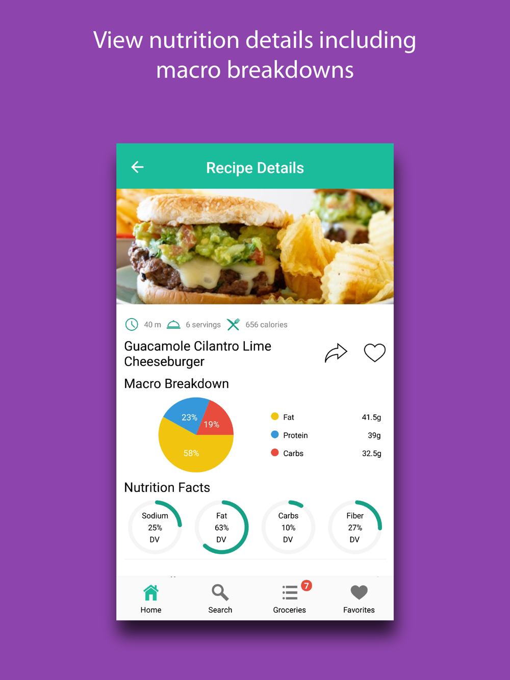 View nutrition facts, macro breakdowns, and cooking directions for any recipe.