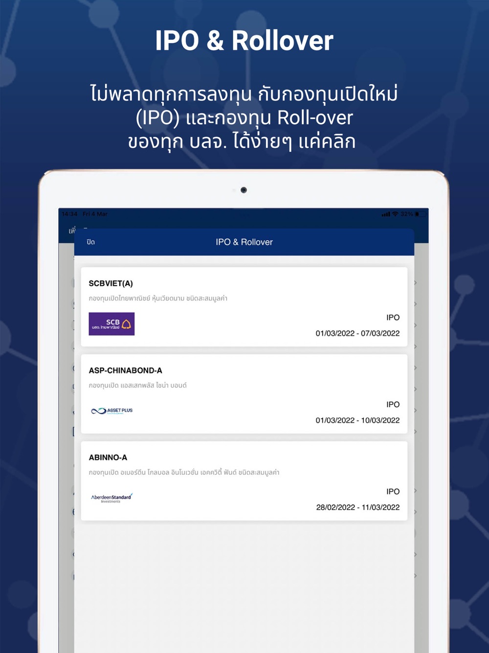 • IPO & Rollover: ไม่พลาดทุกการลงทุน กับกองทุนเปิดใหม่ (IPO) และ กองทุน Roll-over ของทุกบลจ. ลงทุนได้ง่ายๆแค่คลิก