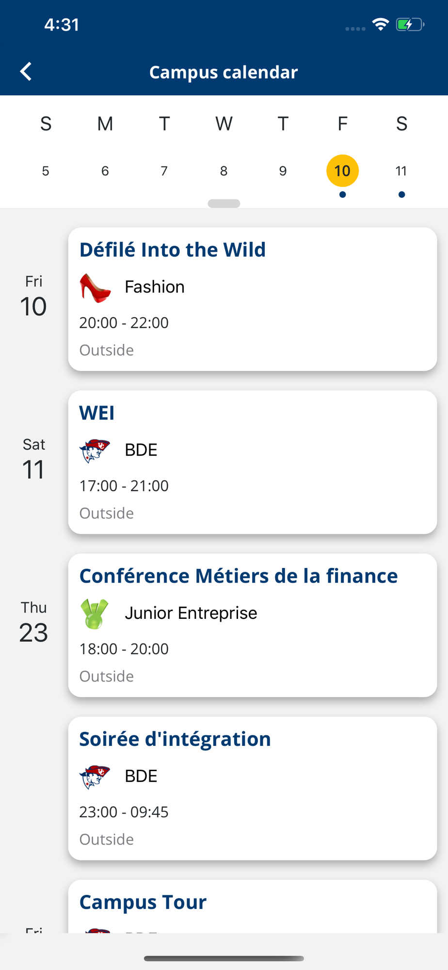 Join the App dedicated to your student life and find all the events organized by clubs on a timeline (days, times, places, links to get a ticket…).