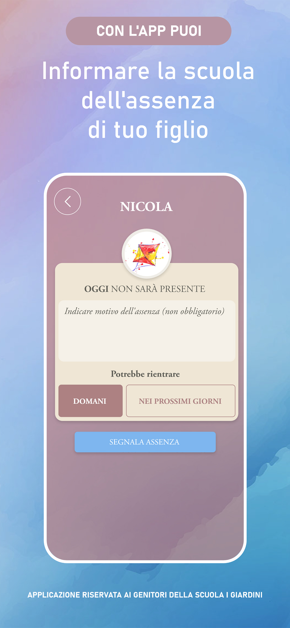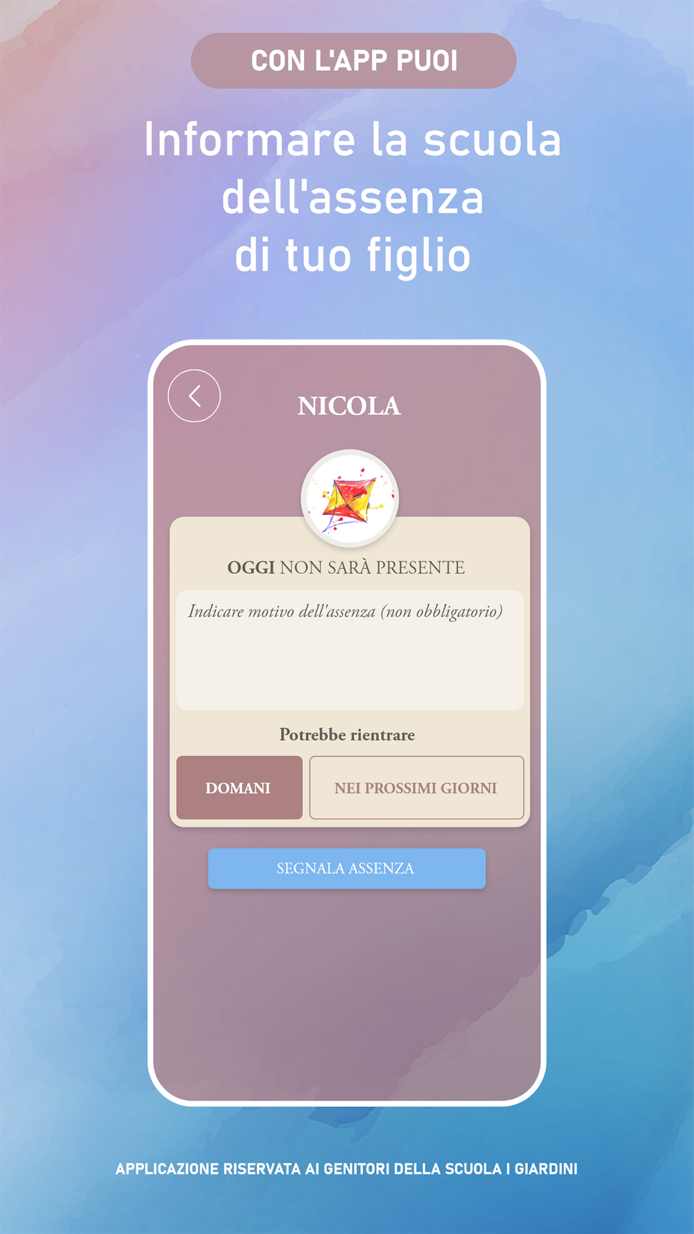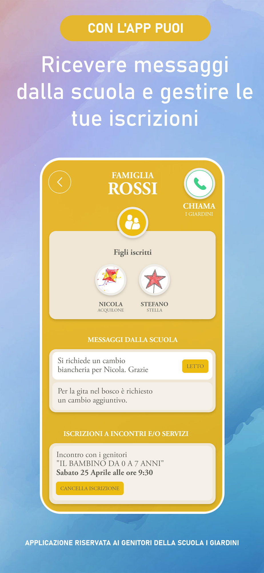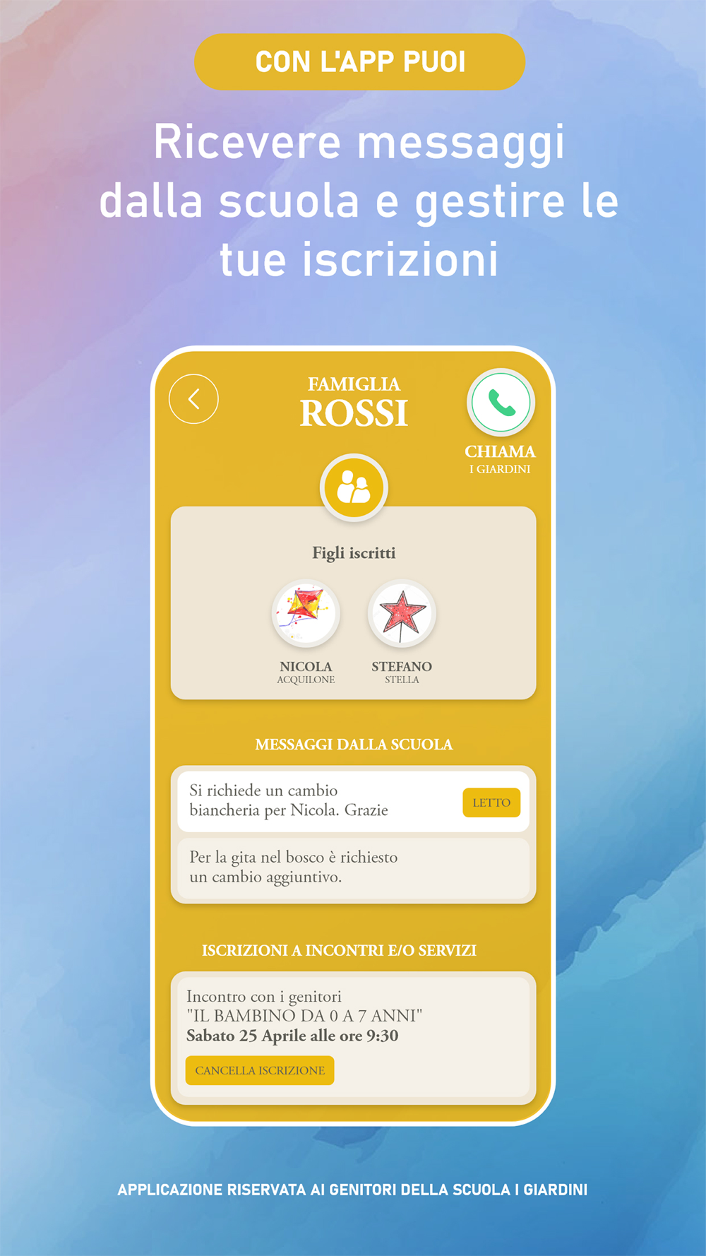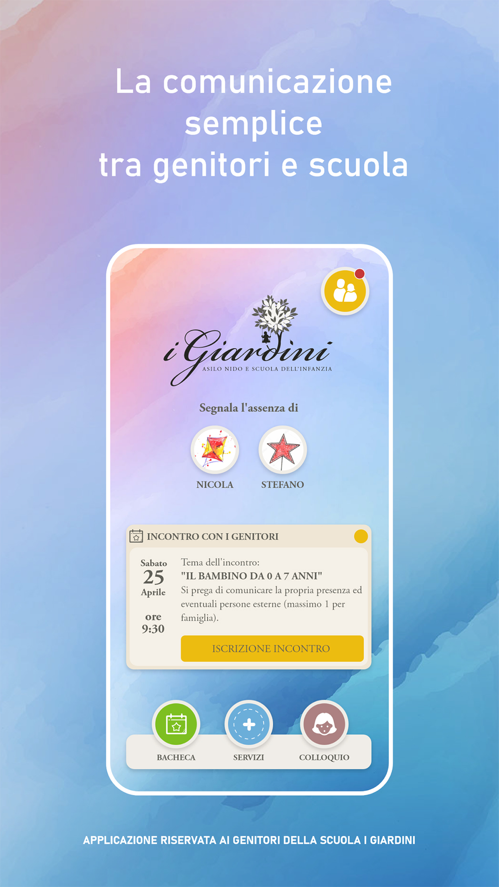 L'applicazione I Giardini offre un semplice ed efficace strumento di comunicazione tra la scuola e i genitori dei bambini iscritti. Con le credenziali fornite da I Giardini il genitore potrà segnalare l'assenza del proprio figlio, iscriversi alle iniziative e servizi della scuola, ricevere comunicazioni riservate da parte della Direzione.