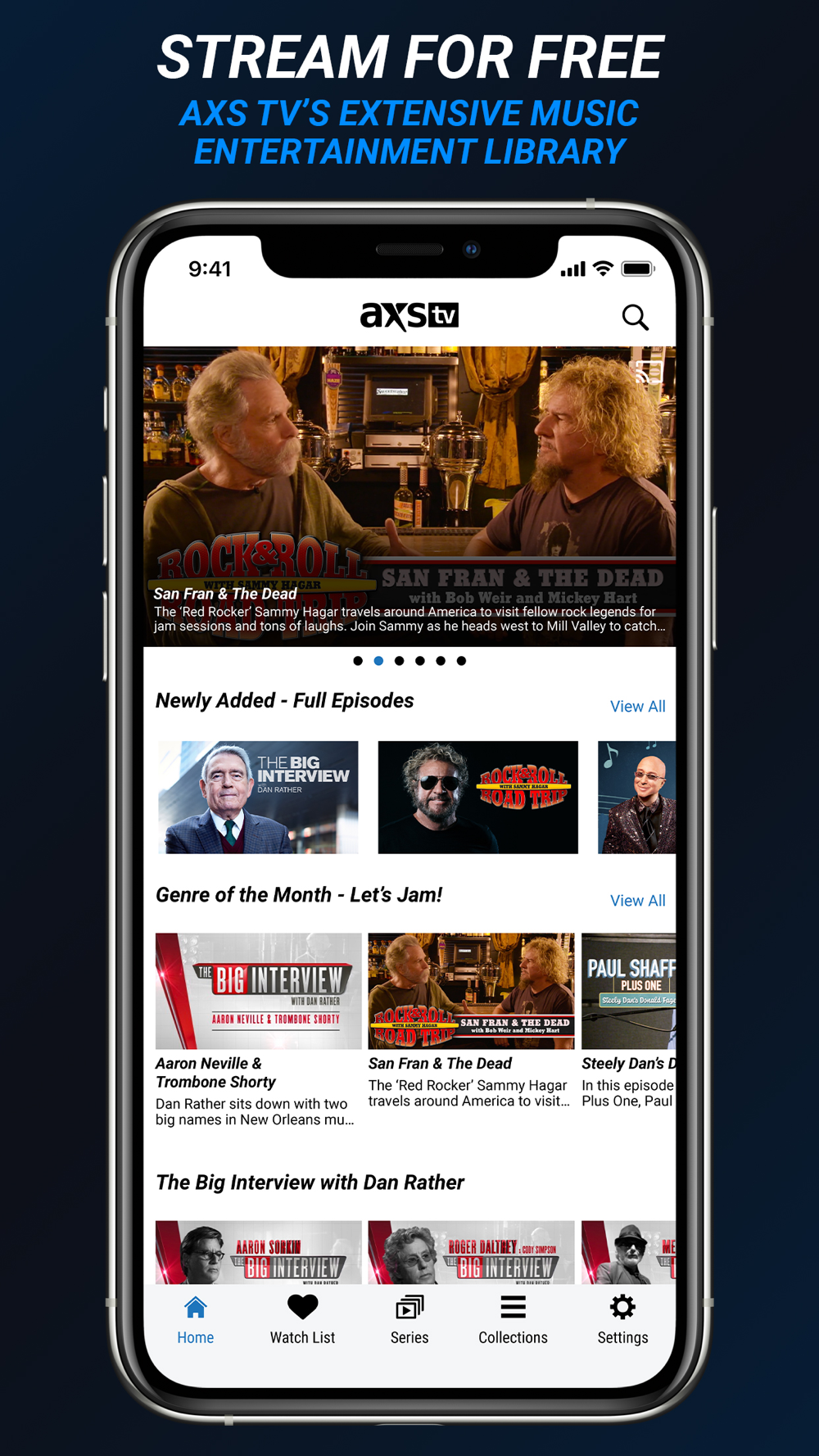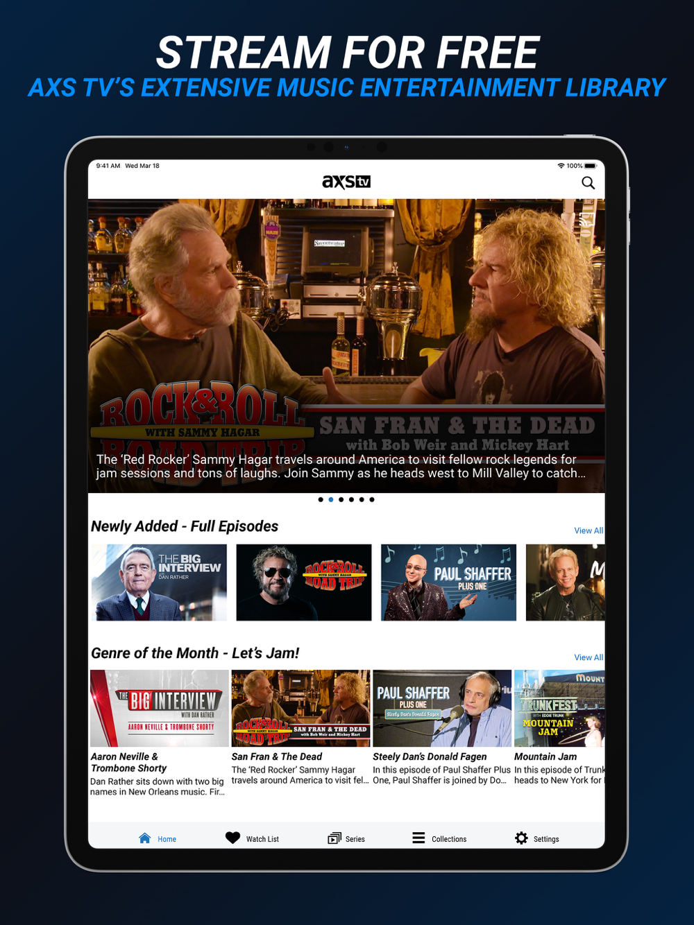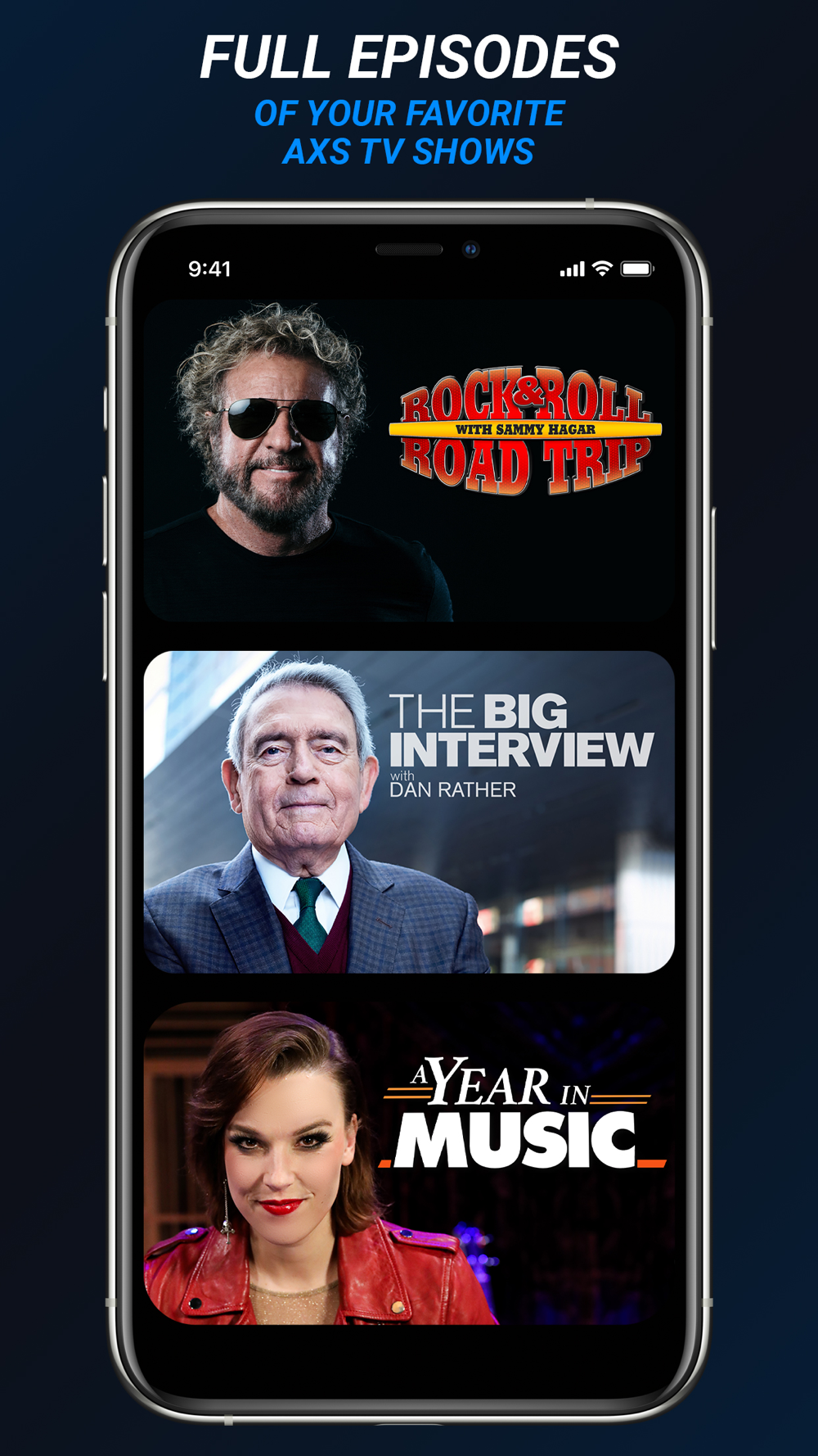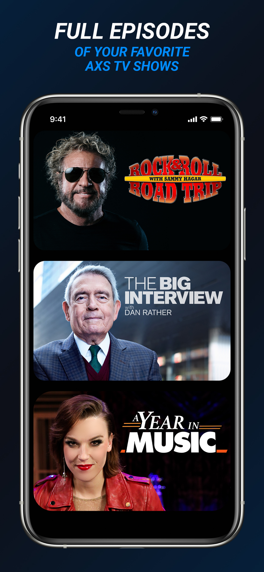 Watch epic concerts, compelling music documentaries, insightful artist interviews, and full-length episodes of original shows all on the AXS TV app. Hours and hours of awesome music content, free with ads, perfect for any and every rock and roll fan. Just download and start watching right now, no signup or credit card required.