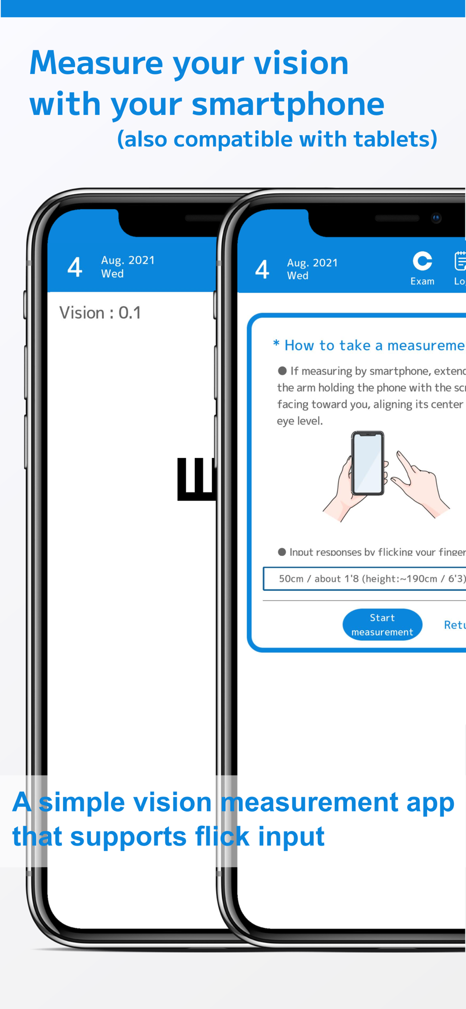 Unlike vision measurement apps where you input your response by tapping a button, this app uses flick input, allowing you to maintain a natural posture throughout the test even when measuring with a smartphone.