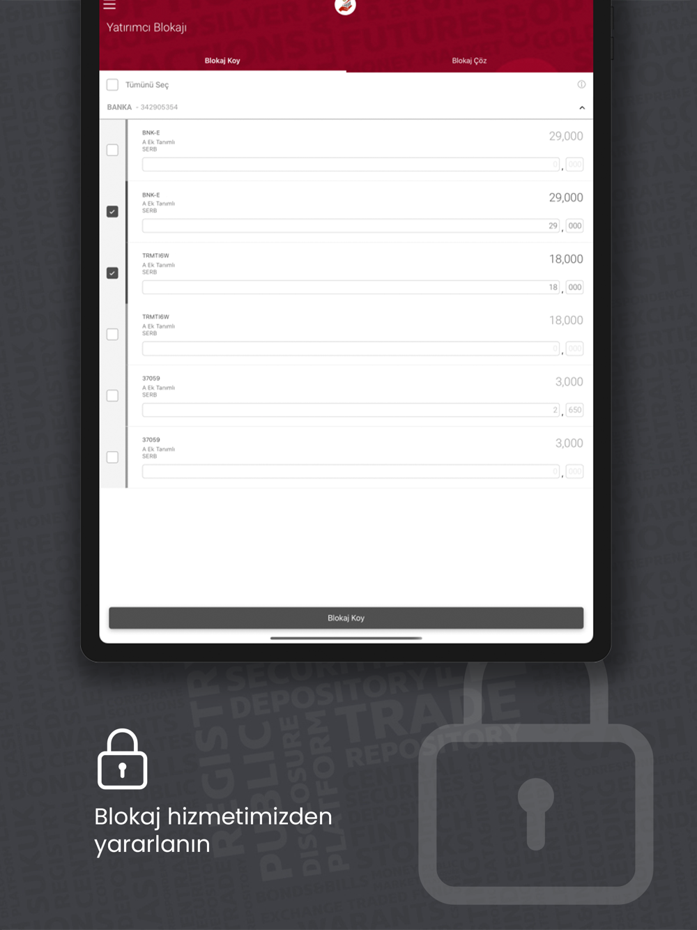 By logging in the e-INVESTOR application, you can monitor your investment accounts opened in intermediary institutions and banks, view securities’ activities in your portfolio apply investor’s blockage on securities in your portfolio. Furthermore, you can track and/or report corporate action events of companies you have invested, and benefit notification service about transactions happened settled in your investment account/s and use other functions that the application offers.