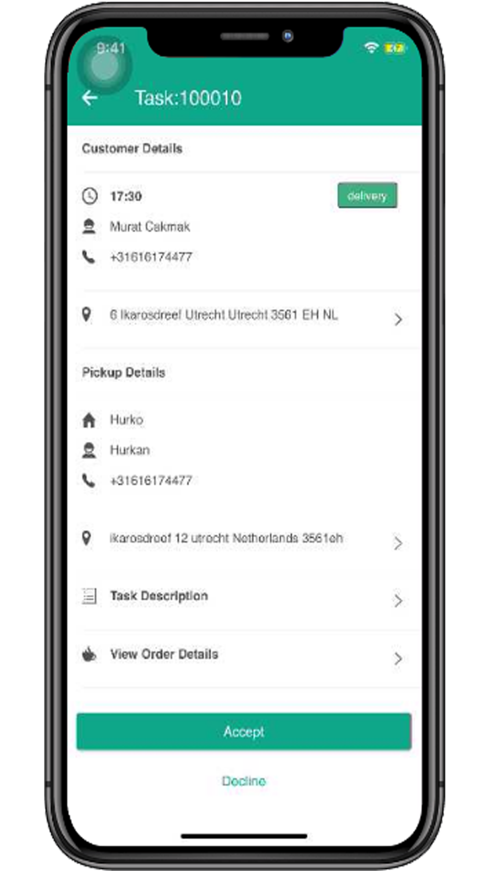 7: TASK must be entered by the delivery boy to verify the delivery is conducted by him to the right customer.