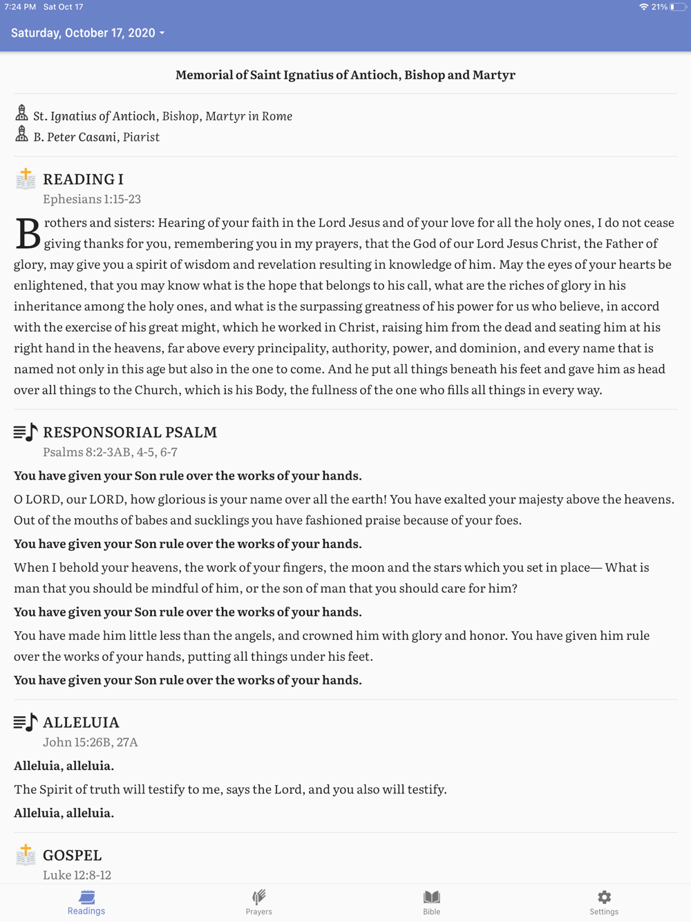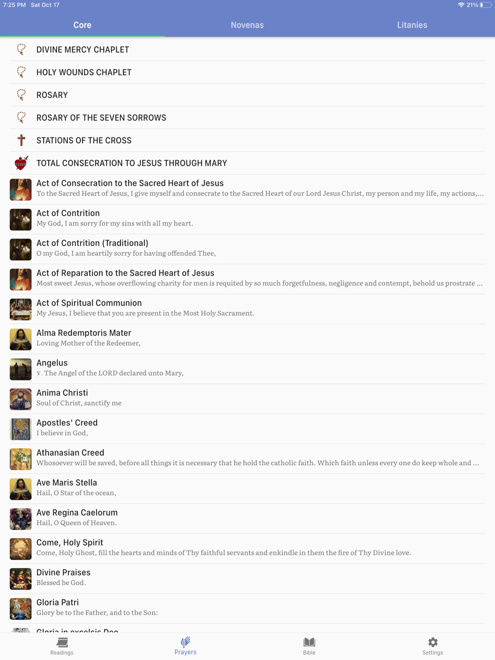* Prayers, including scriptural Rosary, Divine Mercy Chaplet, Holy Wounds Chaplet, Stations of the Cross, Rosary of Seven Sorrows, 30+ novenas, litanies.