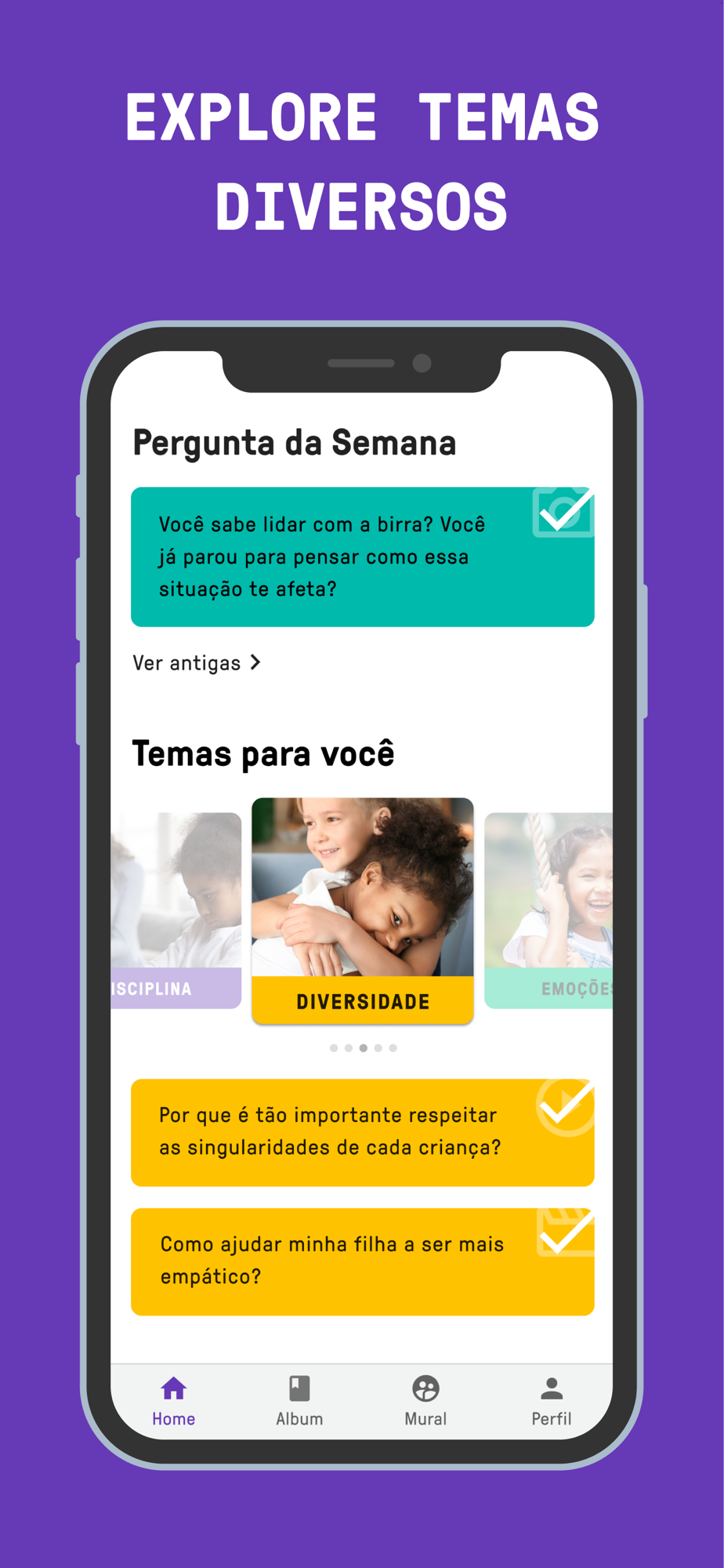 Aqui você encontrará conteúdo e atividades práticas para serem feitas em família que abordam os temas mais pedidos por vocês como: Desenvolvimento, Disciplina, Diversidade, Emoções e Relações.