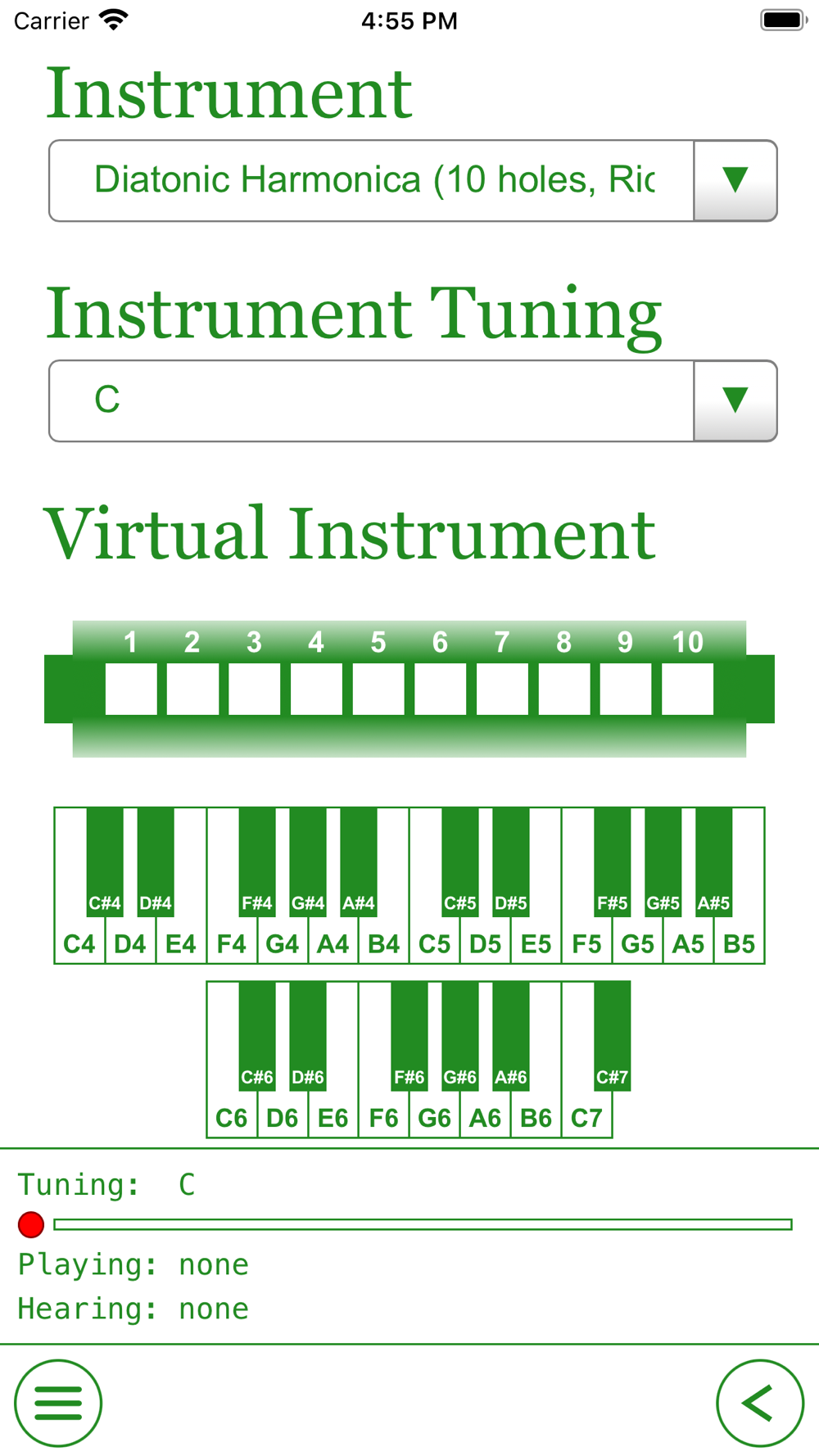 --- 10-hole diatonic harmonica (Richter standard tuning, in keys from low-low F (F2) up to high G(G4)).
