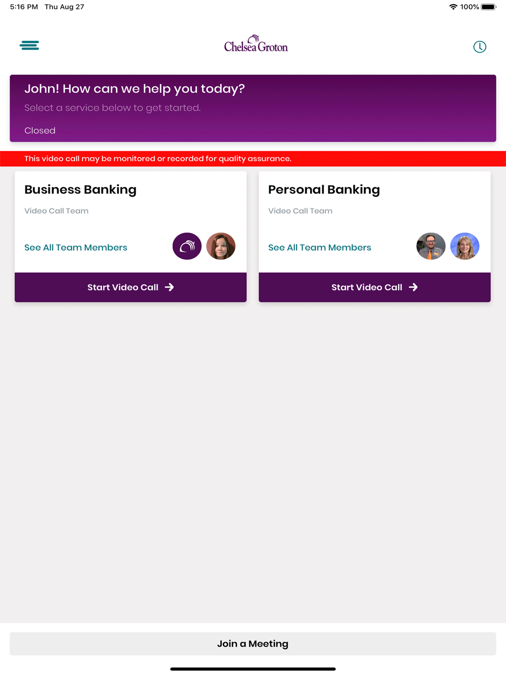 Chelsea LIVE Video Banking lets you securely interact with the Chelsea Groton banking team remotely. The app allows you to video chat, review and sign documents and conduct business all in one simple tool.