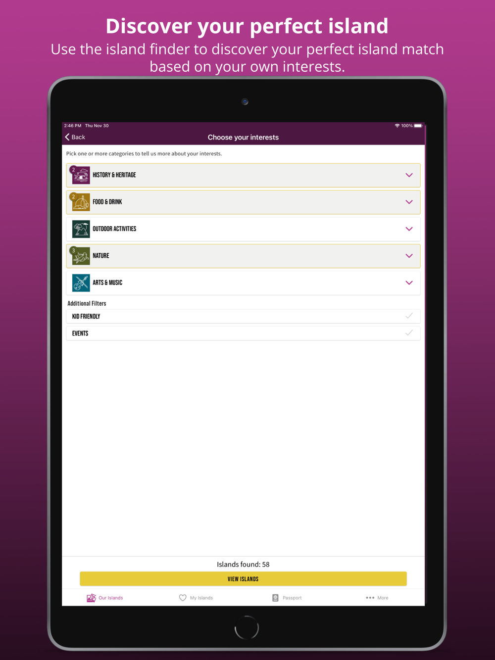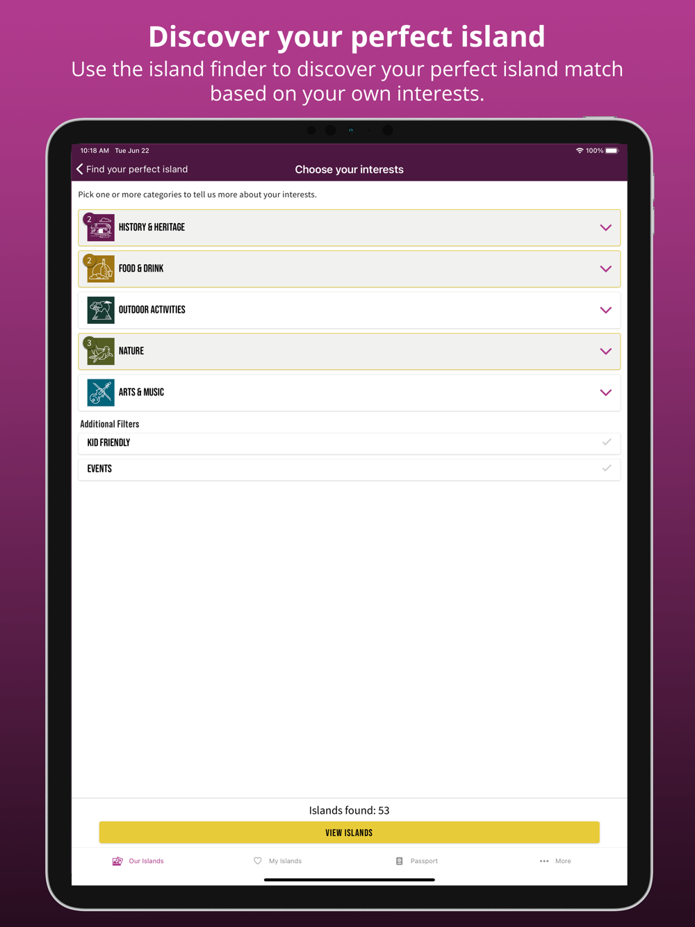 Collect them all! Stamp your passport when you visit each island, with individual stamps designed by local artists to represent a unique aspect of island heritage.