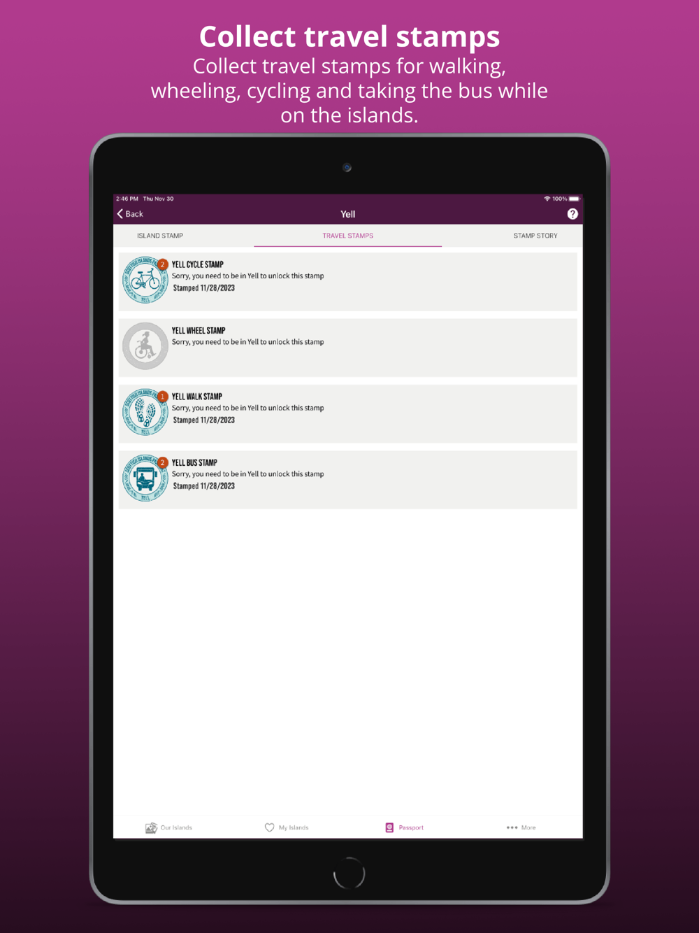 Collect travel stamps for each island when you walk, wheel, cycle and take bus journeys while on the island. There is no limit to the amount of travel stamps that can be collected!