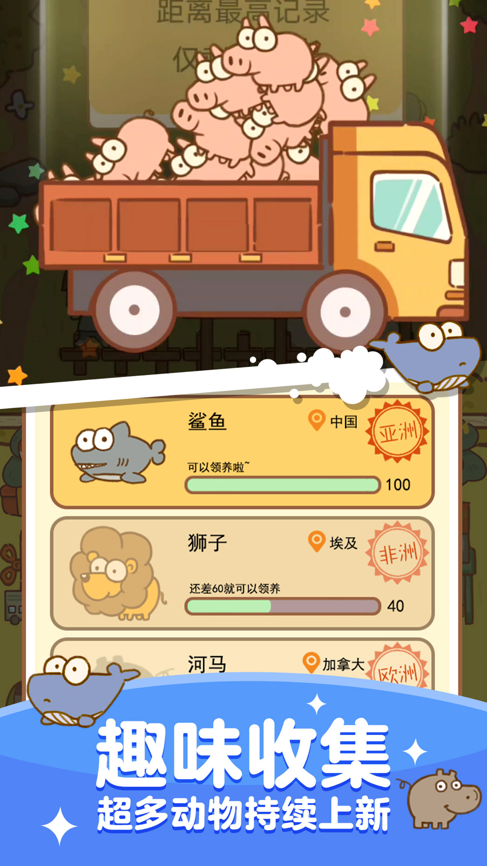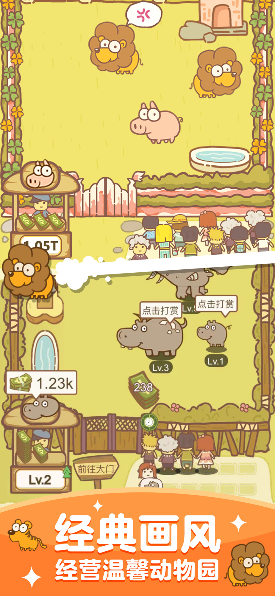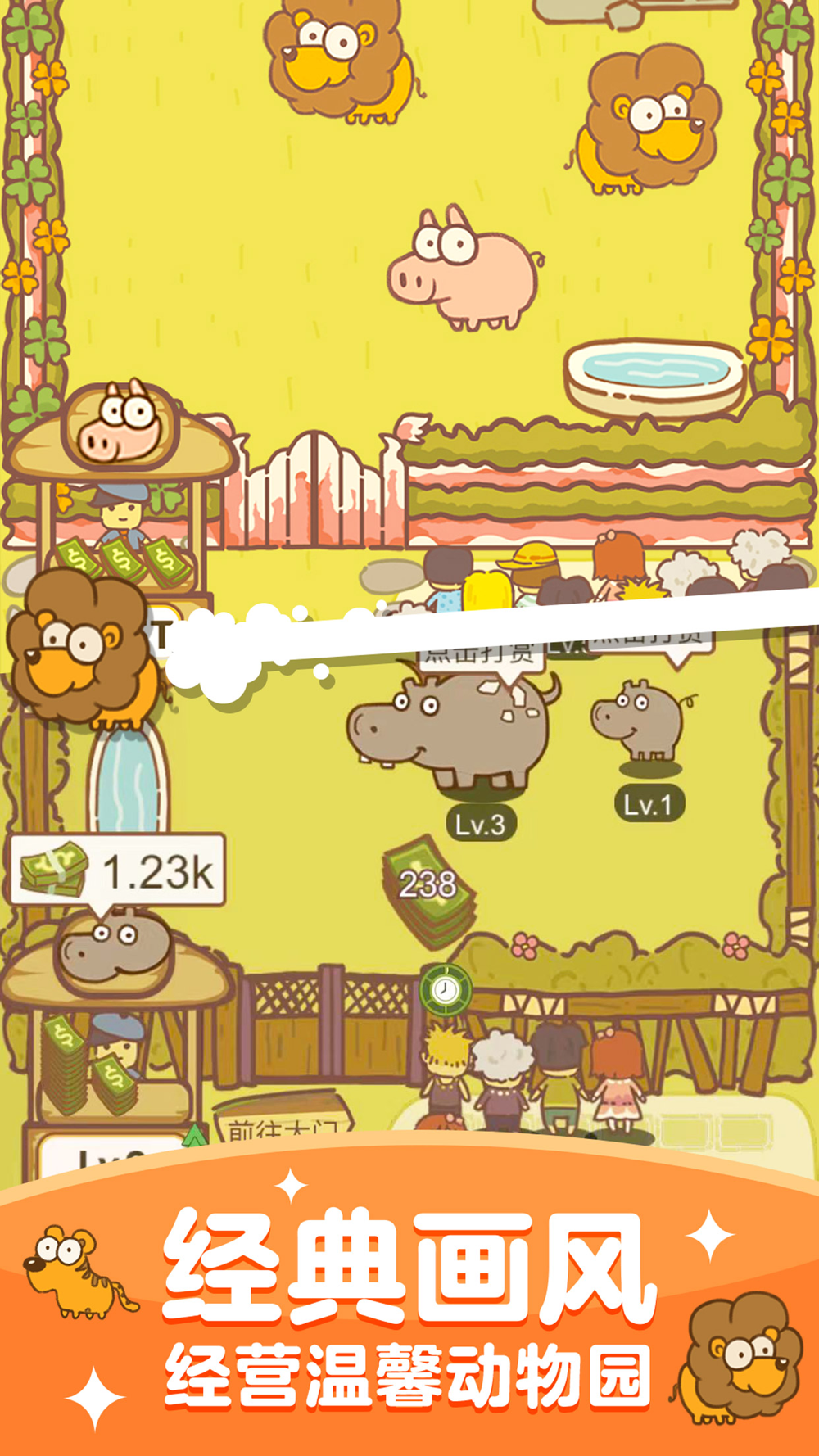 欢迎来到动物园,你就是新的管理员吧?马上就要举行开园仪式了,但是园内连一只动物都没有。该怎么办呢?别急,我们组织一只考察队,去寻找和营救落魄的小动物们。身为新管理员的你,可以通过营救或者寻找动物,去搜集可爱的动物们,青蛙、蜗牛、河马、犀牛等等,它们都可以成为你的新伙伴。当园内开始饲养动物,就可以售卖门票,广告宣传,招揽更多的游客,只要你用心经营,游客总会络绎不绝!