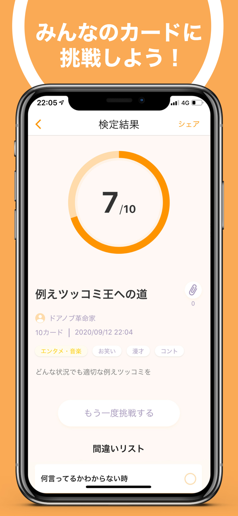 作成されたカードセットを元に、検定を学習に最適化されたプログラムで自動生成。勉強の進捗チェックだけでなく、趣味の共有やクイズバトルにも!間違えたカードは一覧で表示、復習にもバッチリだぜ!