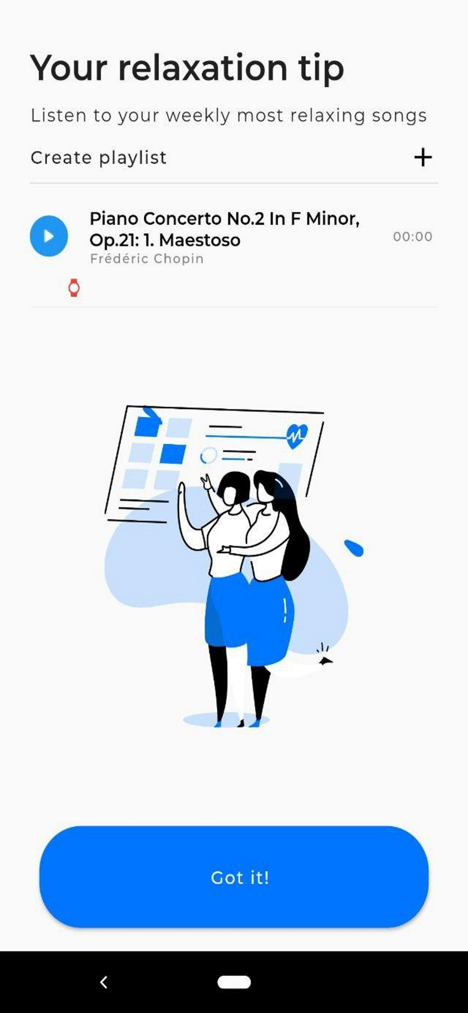 Over all, the app gives the user a way to measure the well-known effect of music on himself, while optimizing his well-being and managing his stress levels.