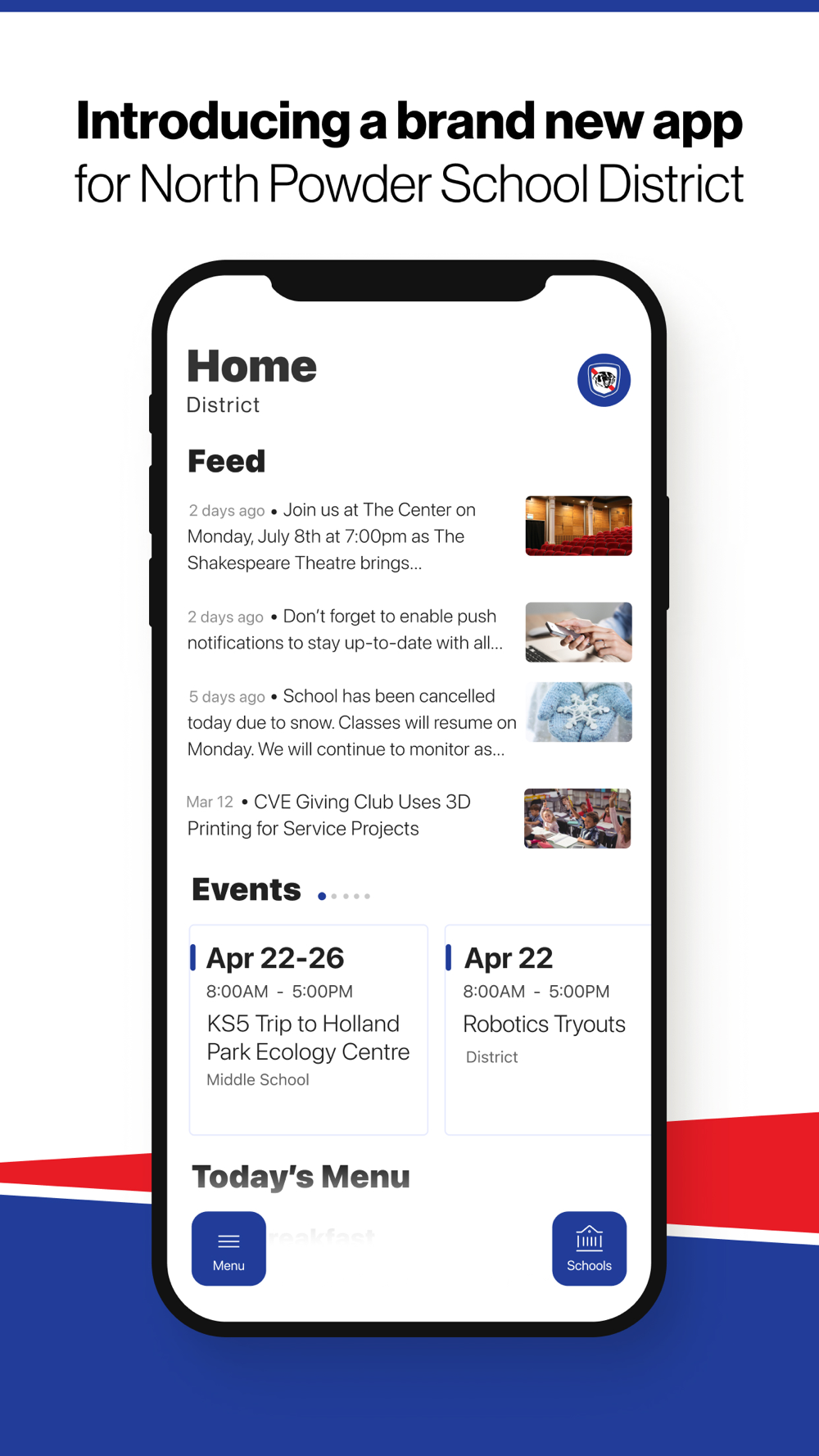 The event section shows a list of events throughout the district. Users can add an event to your calendar to share the event with friends and family with one tap.