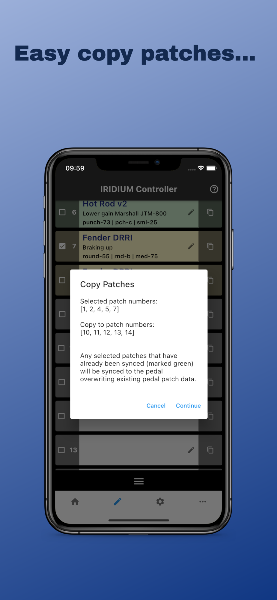 Import and Export selected patches to your device, iCloud, Airdrop, messenger etc. Good for backing up, having setlists or sharing with others.