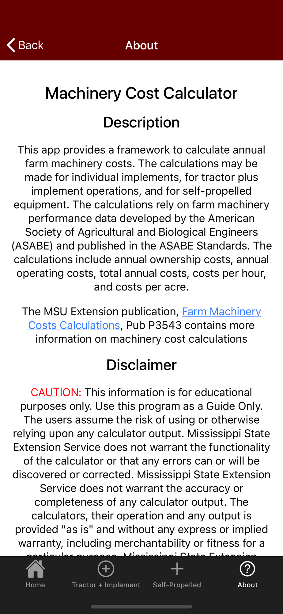 MSUES Machinery Cost Calc provides a framework to calculate annual farm machinery costs. The calculations may be made for individual implements, for tractor plus implement operations, and for self-propelled equipment. The calculations rely on farm machinery performance data developed by the American Society of Agricultural and Biological Engineers (ASABE) and published in the ASABE Standards. The calculations include annual ownership costs, annual operating costs, total annual costs, costs per hour, and costs per acre.