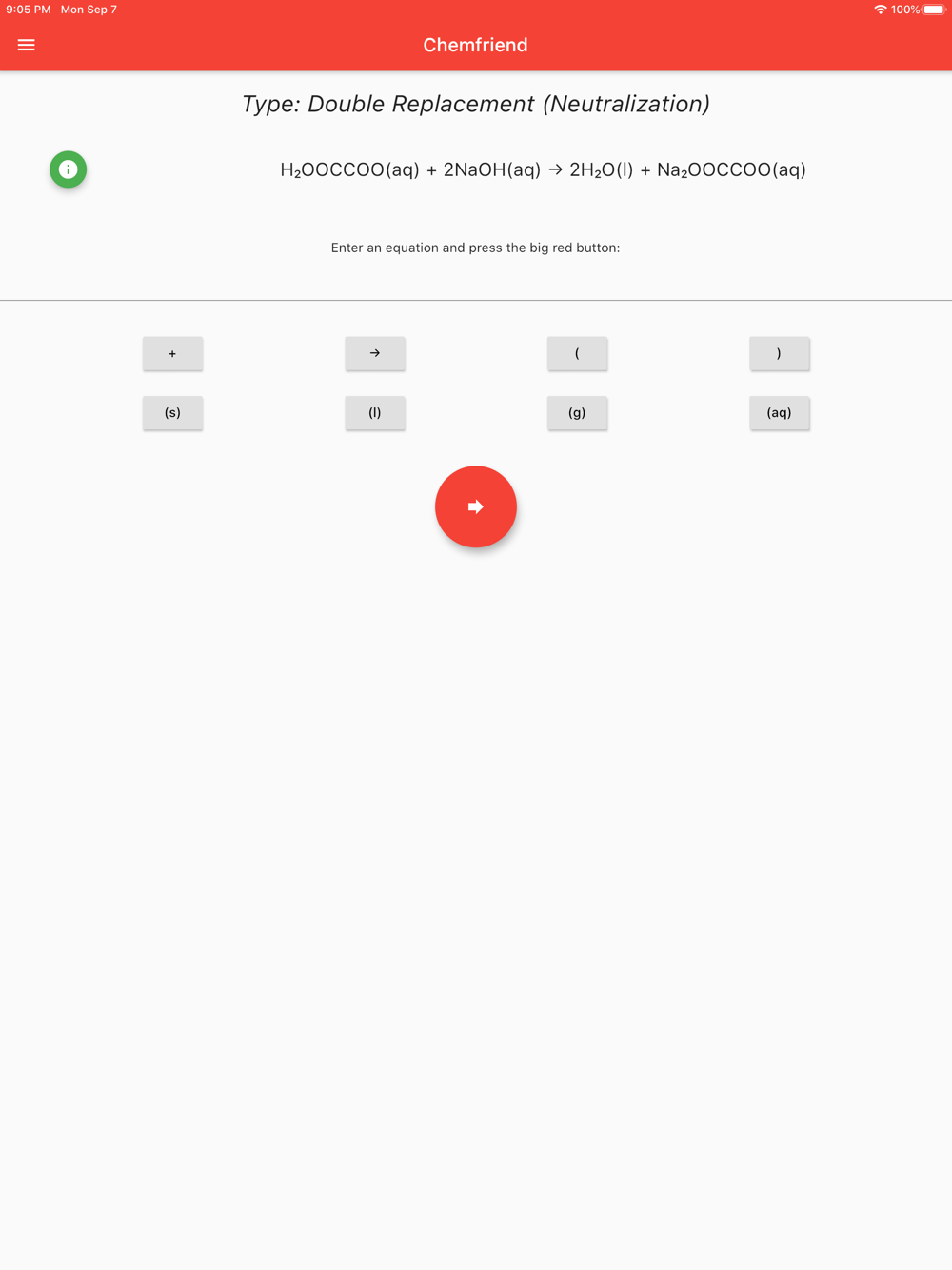 Don't know the products? No problem. Chemfriend automatically finds what the products of the equation if none are given. It also tells you what the type of the equation is.