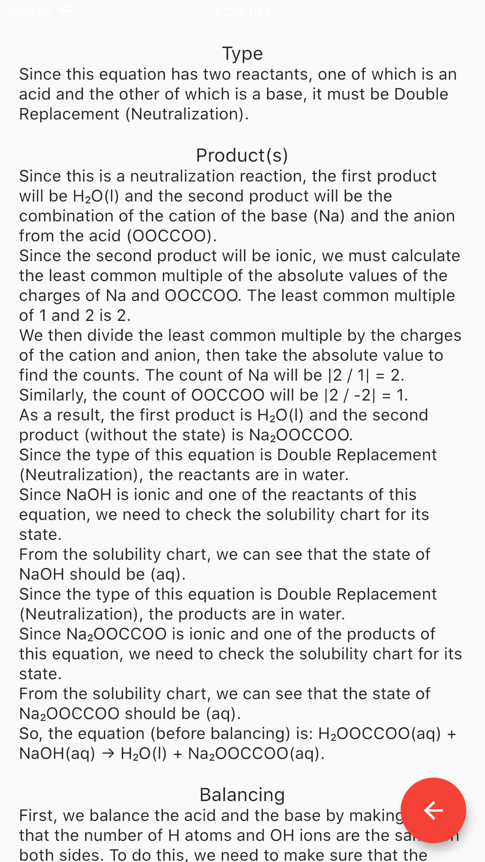 If you're not sure how the app came up with the balanced equation, just tap the info button beside the equation and look through the detailed, step-by-step explanation that describes each part of the process.