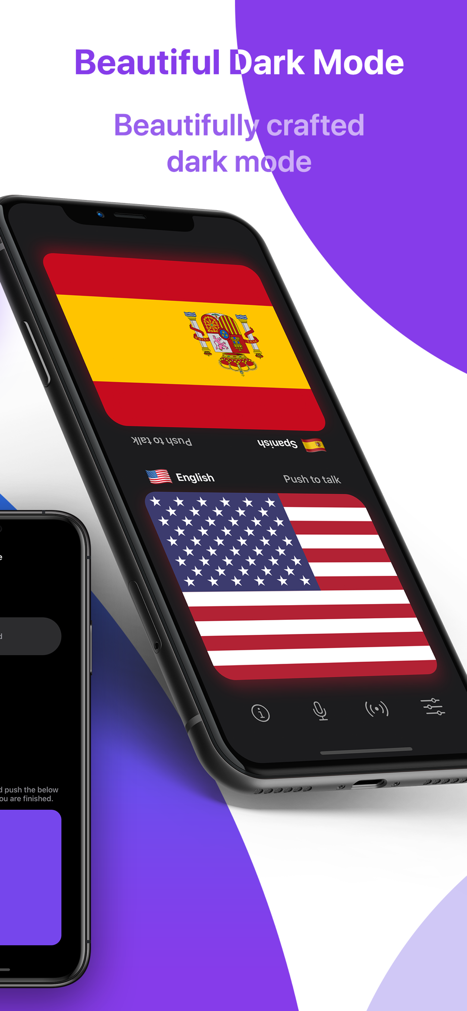 You can also use two separate iPhones to talk to each other wirelessly. Like in a regular phone call, hold your iPhone to your ear and push the purple button to talk. Your conversation partner will hear the translation through the iPhone earpiece.