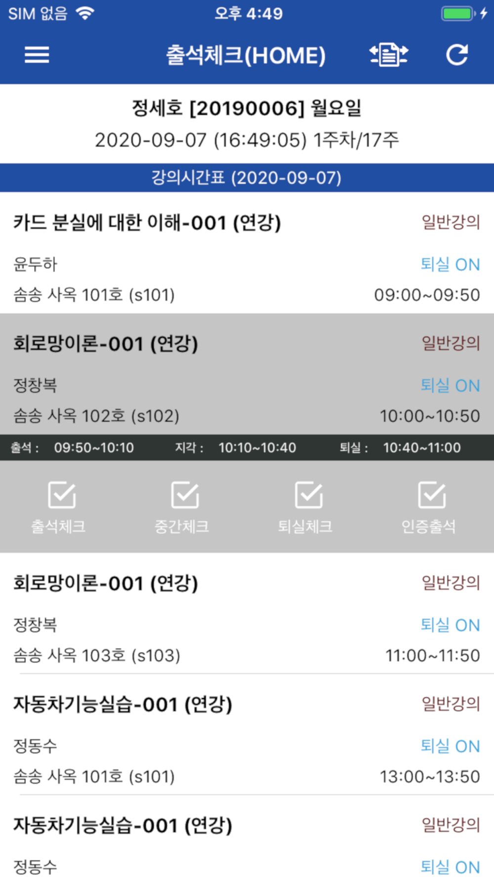 초기화면에서 ‘전자출결시스템’을 선택하여 강의별 출석체크 및 다양한 기능을 활용 가능합니다.