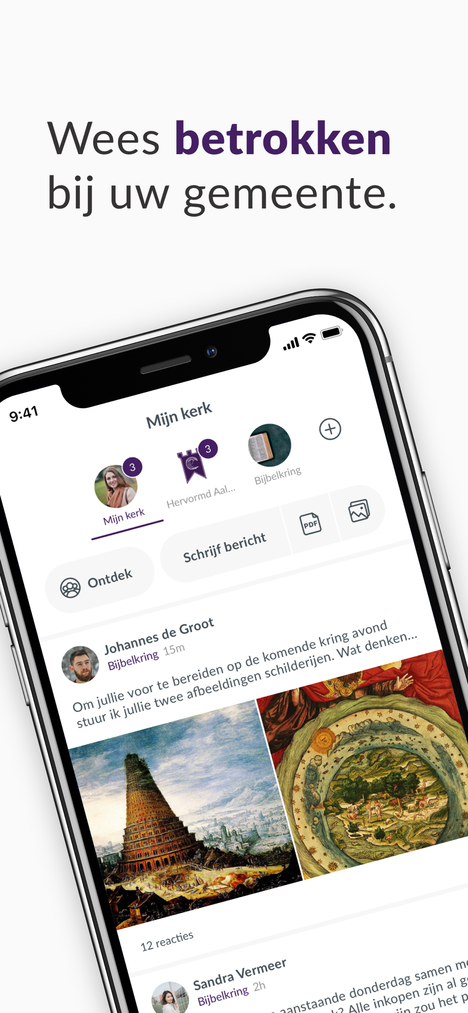 Dankzij onze unieke groepenstructuur helpen wij kerken beter te communiceren. Met de hele gemeenschap, maar ook onderling. U kunt zelf groepen toevoegen en mensen daarvoor uitnodigen. Een slimme timeline zorgt er voor dat iedere gebruiker persoonlijke en relevante informatie ziet.
