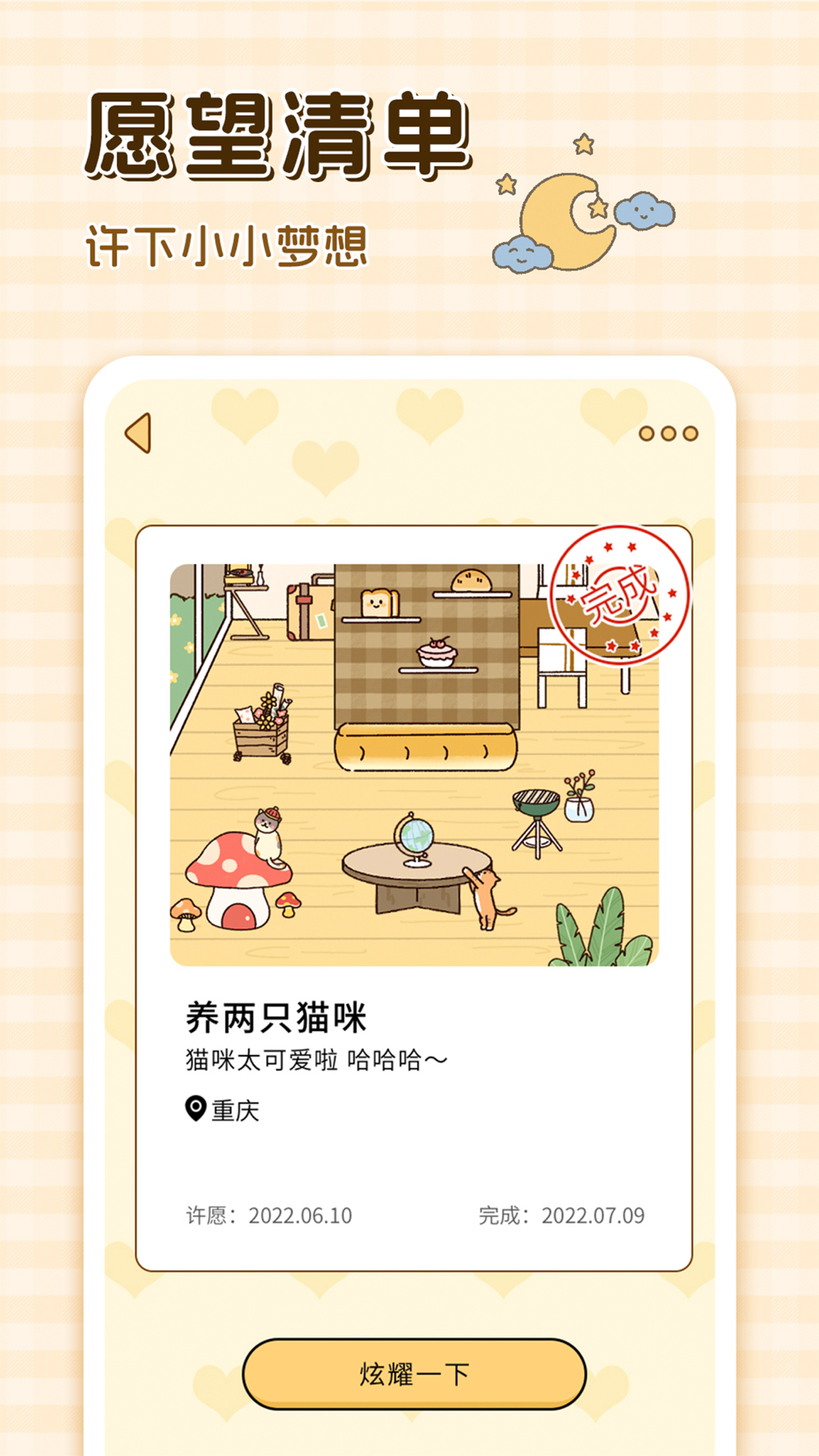 愿望清单——将愿望写下,完成时将标记“已完成”,成就感拉满。总有一天,愿望都将实现。