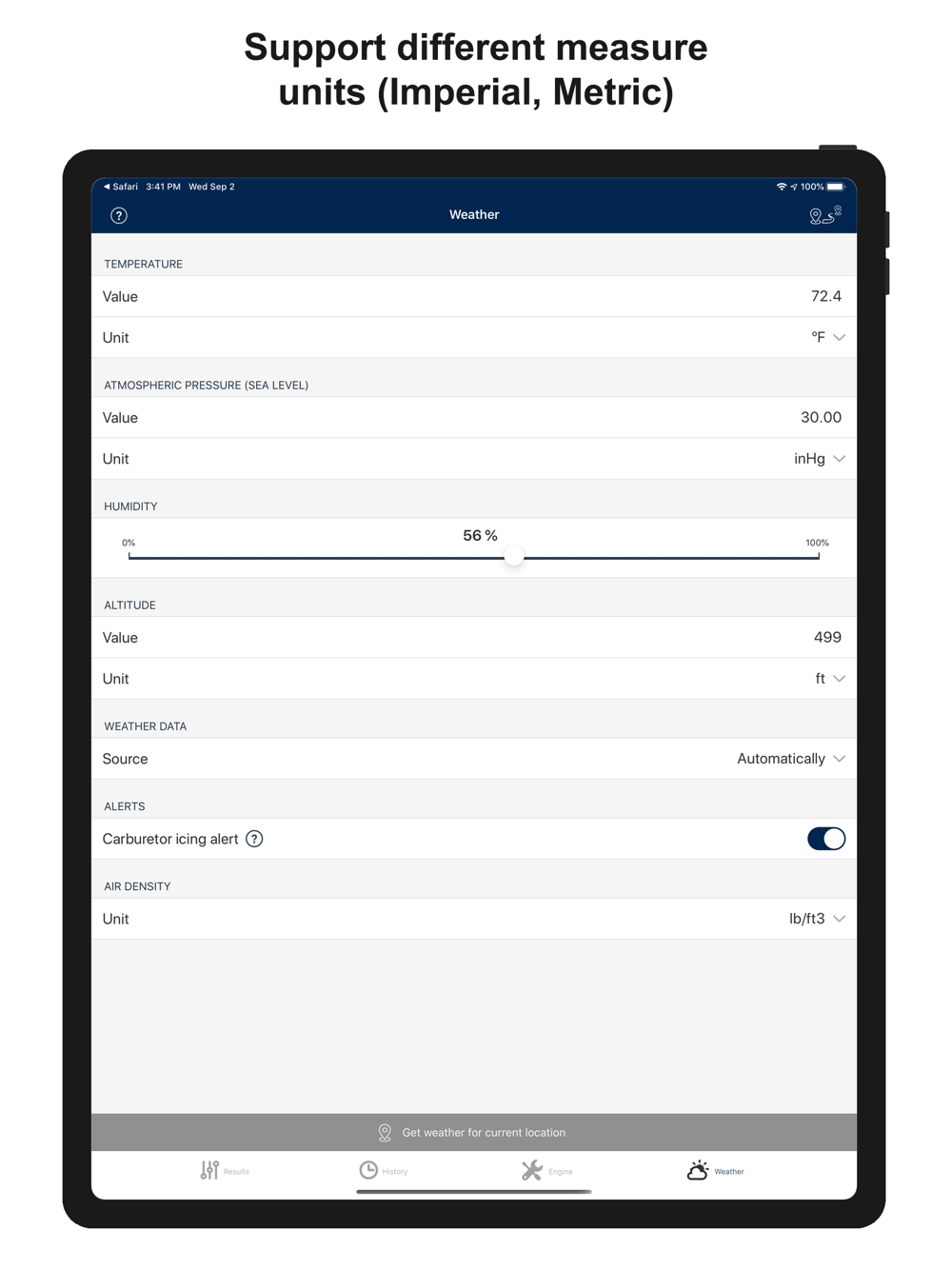 • Weather: In this tab, you can set the values for current temperature, pressure, altitude and humidity. Also this tab allows to use the GPS to get the current position and altitude, and connect to an external service (you can choose one weather data source from several possible) to get the weather conditions of the nearest weather station (temperature, pressure and humidity). In addition, this application can work with a pressure sensor built into the iPhone. You can see if it is available on your device and turn it on or off. Also, on this tab, you can enable alerts about possible carburetor icing.