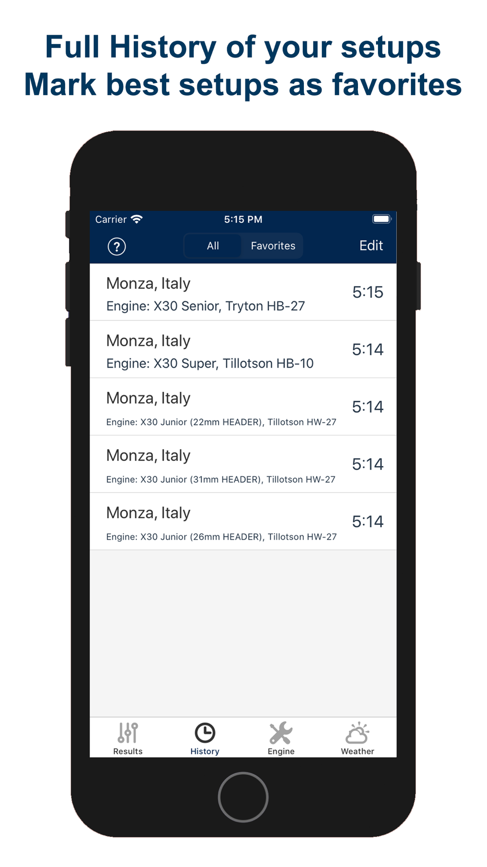 • History: This tab contains the history of all carburetor configs. This tab also contains your favorite carburetor configs.